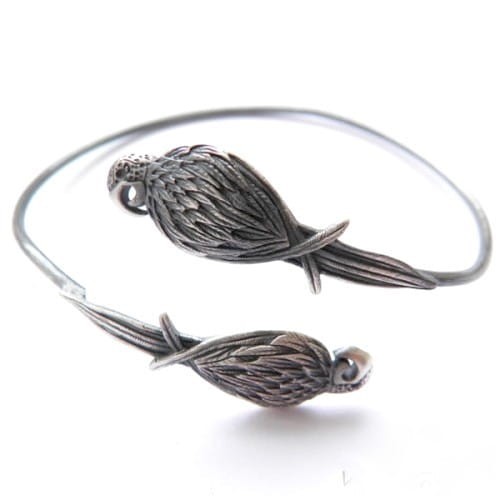 Bransoletka srebrna z gatunku otwartych z dwoma papugami.