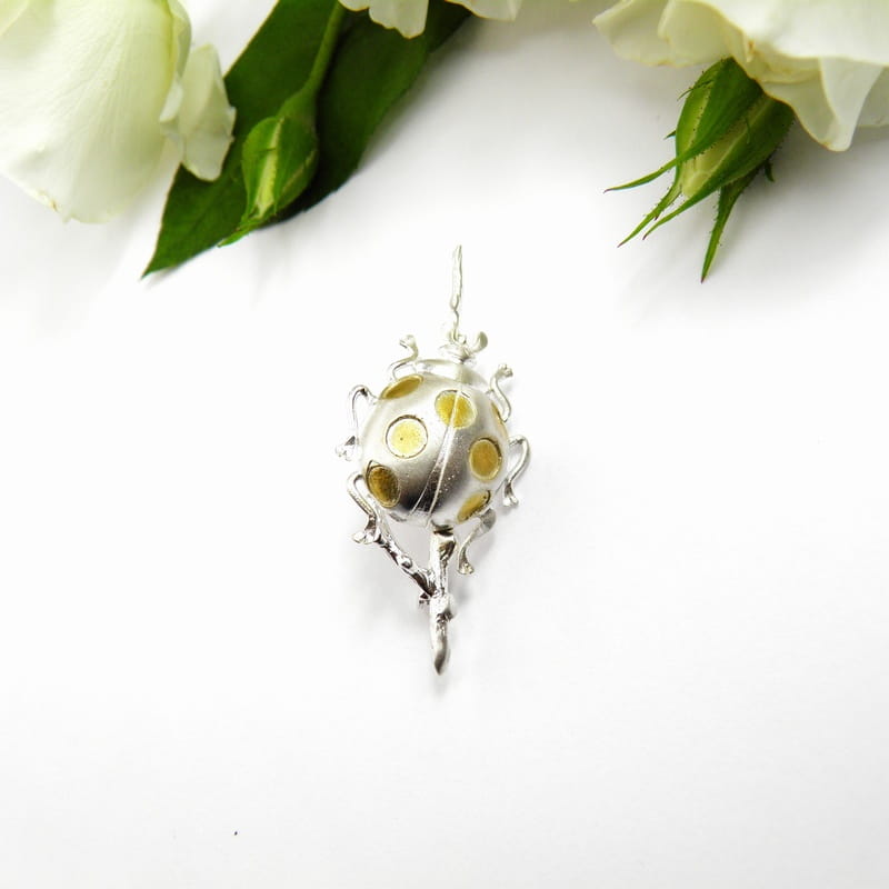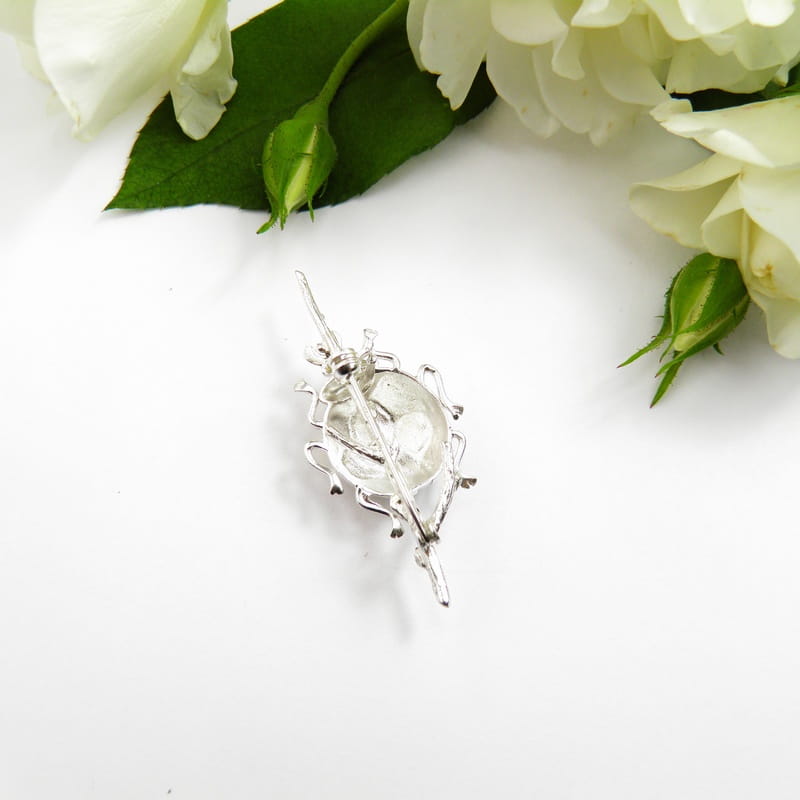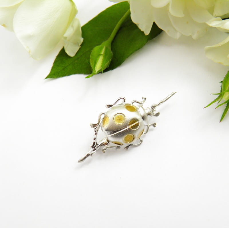Srebrna broszka z białą biedronką na gałązce – elegancka biżuteria pełna uroku