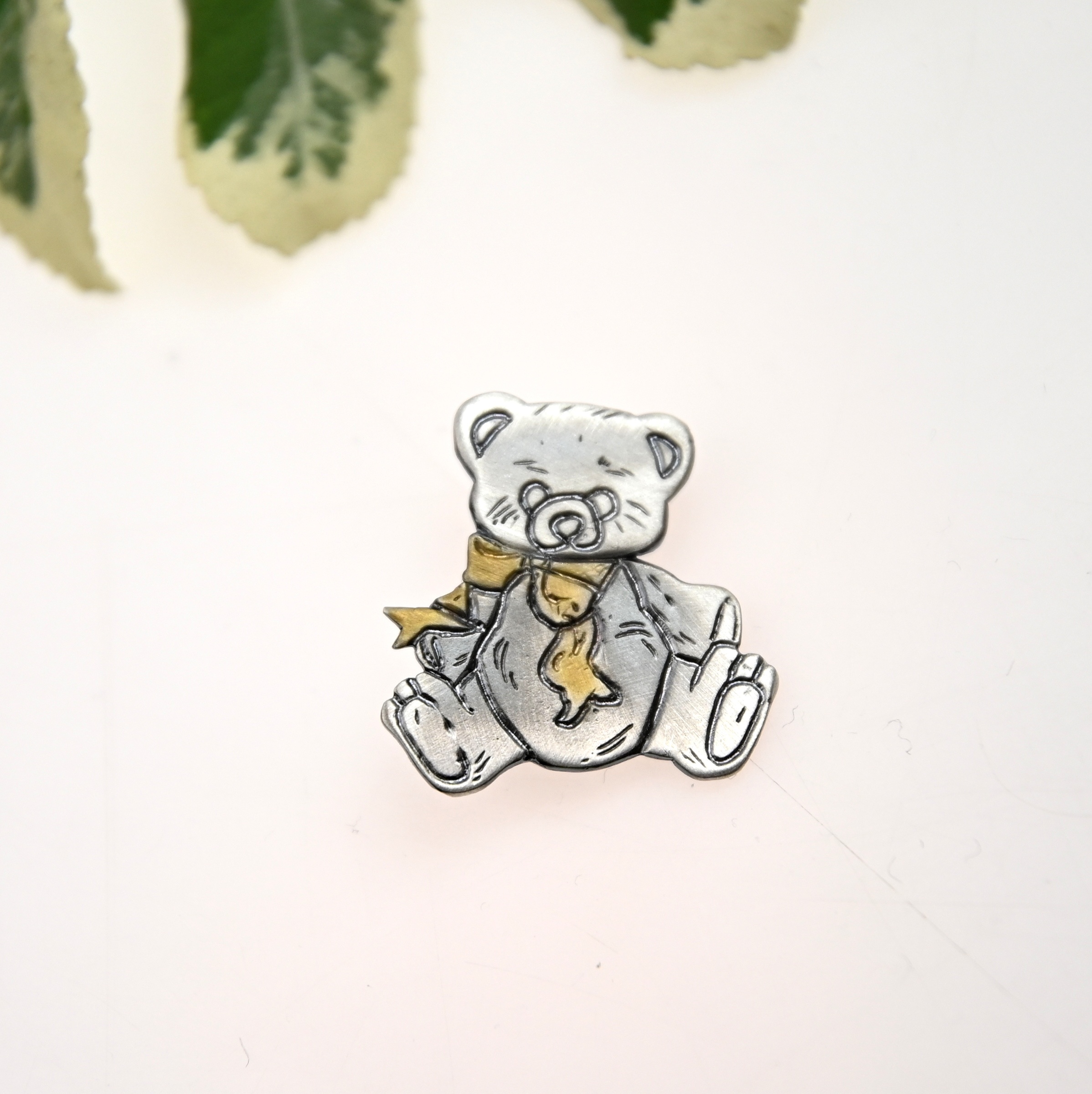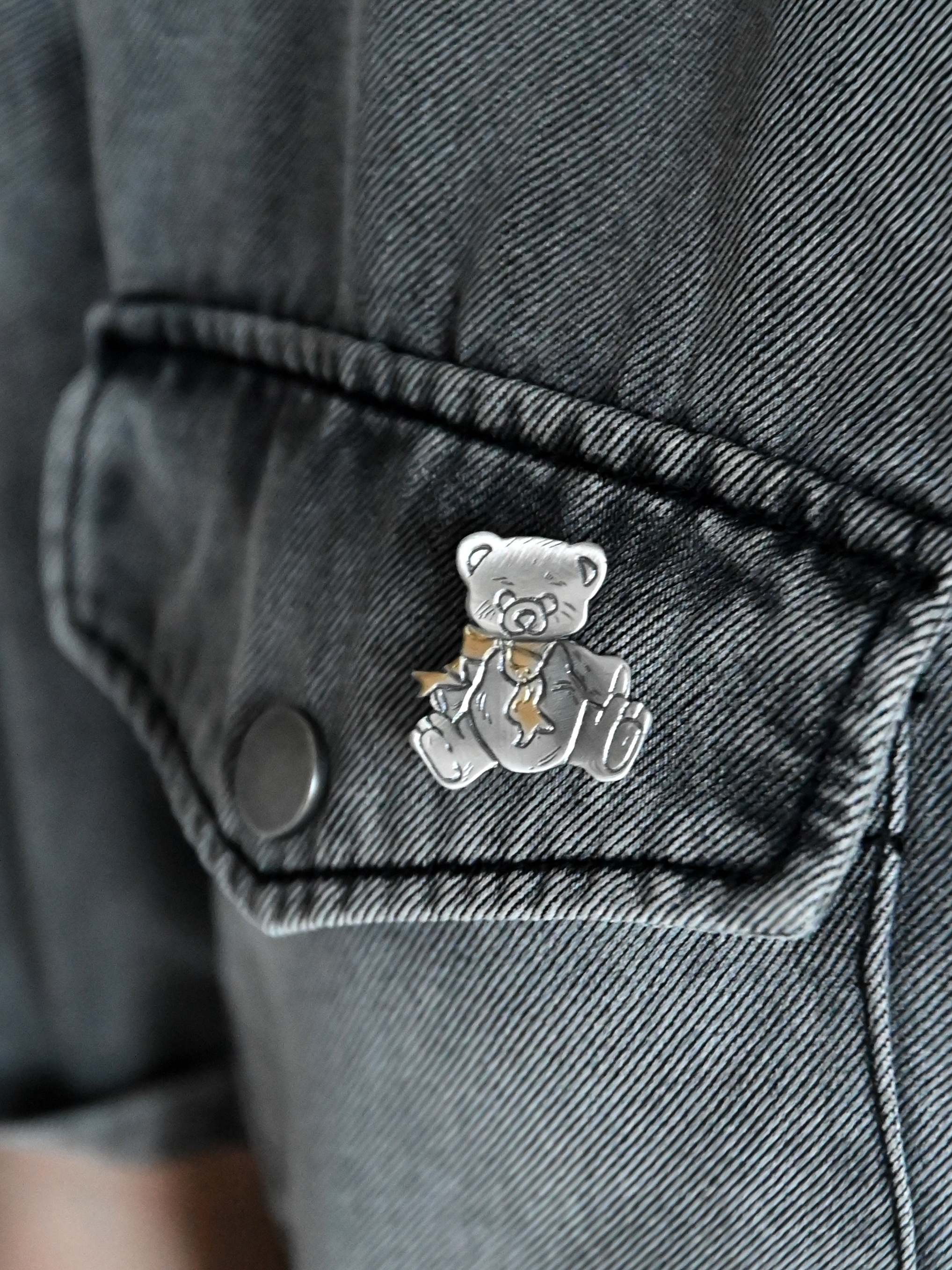 Urocza broszka srebrna przedstawiająca misia to wyjątkowa biżuteria artystyczna, która łączy ciepło dziecięcych wspomnień z elegancją srebra próby 925. Model został zoksydowany na szary kolor, dzięki czemu zyskuje subtelnie przyciemniony, stylowy charakter, a złocony szaliczek dodaje mu ciepłego, kontrastowego akcentu.