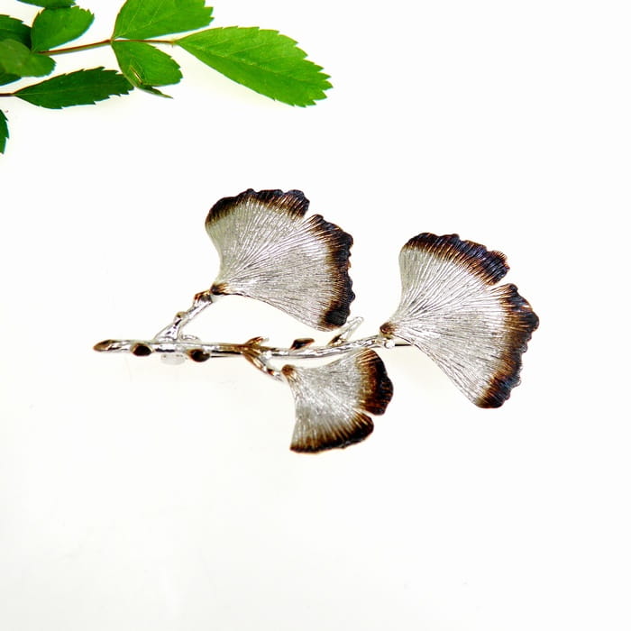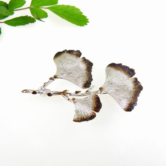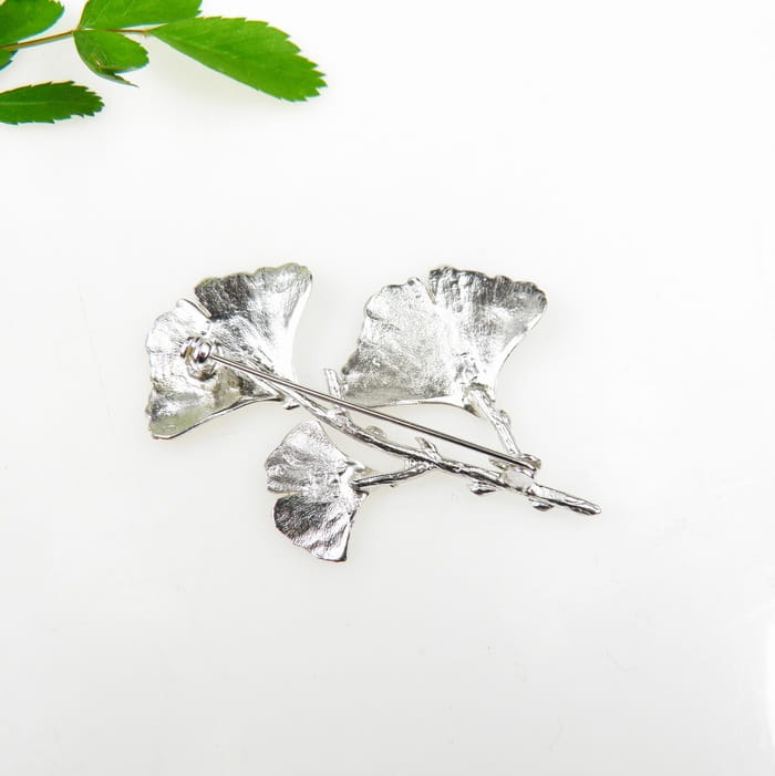 Urocza i oryginalna broszka srebrna przedstawiająca gałązkę z trzema listkami miłorzębu.