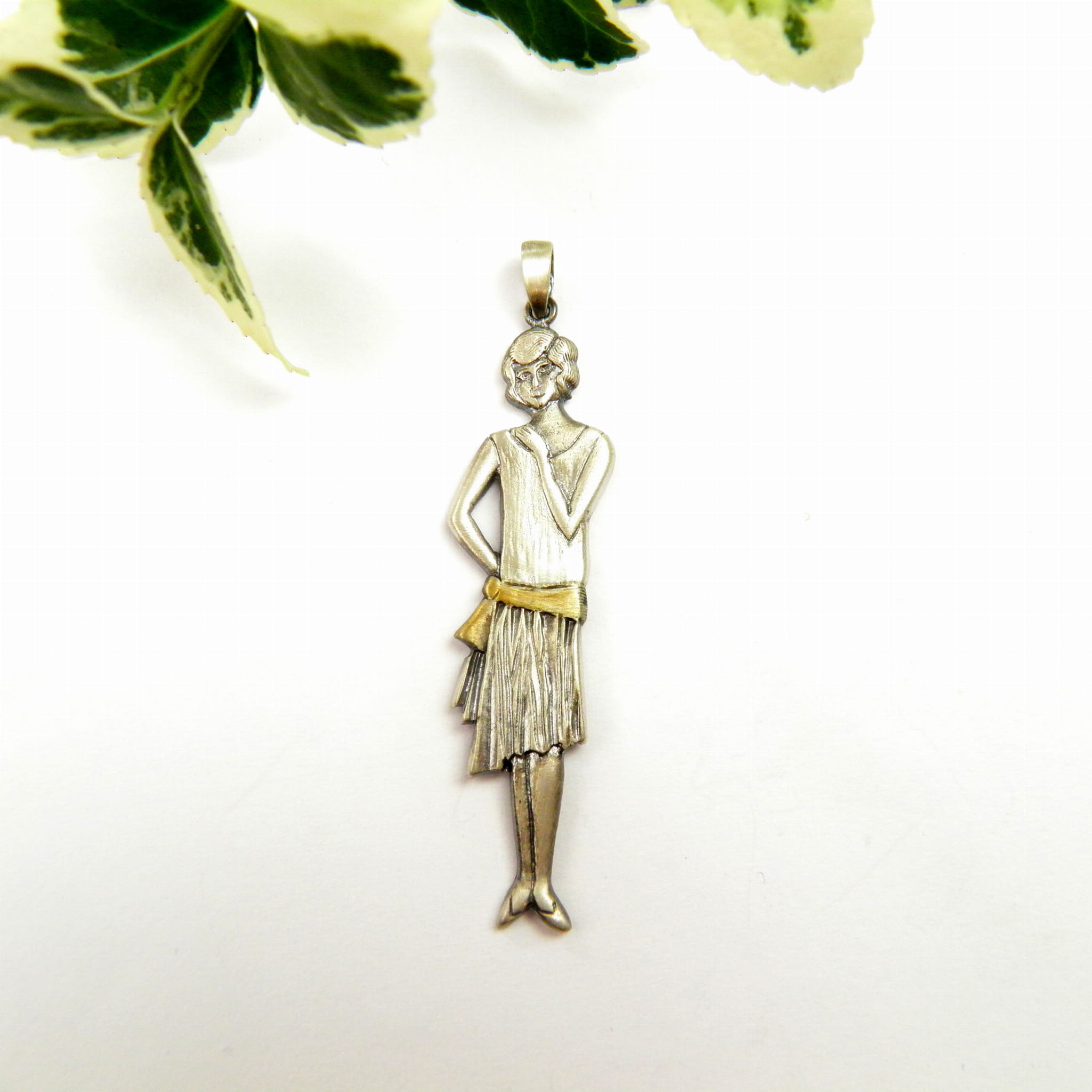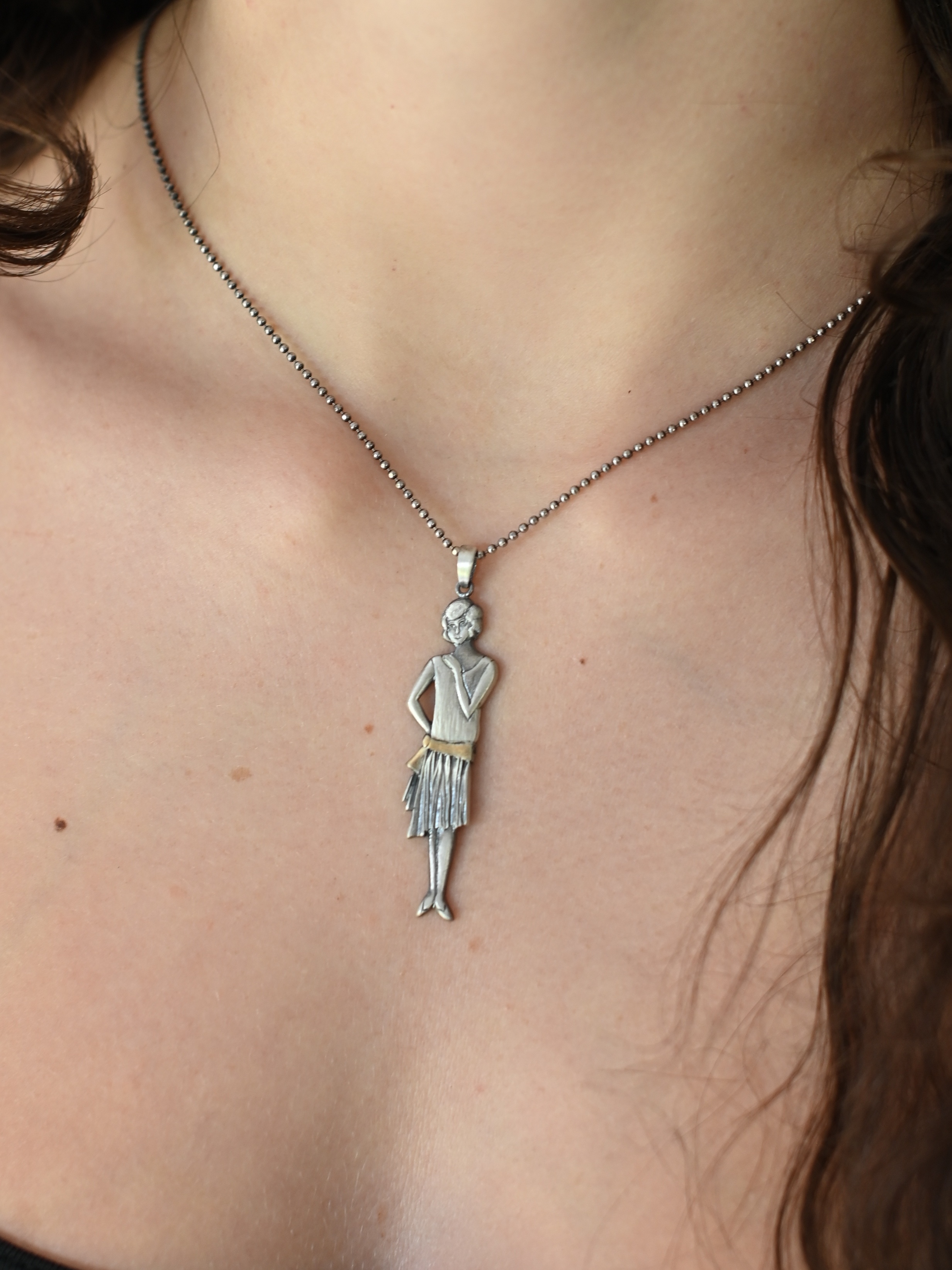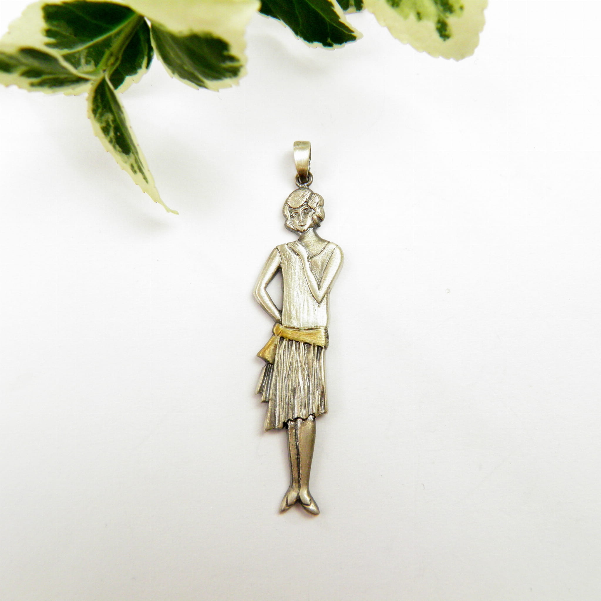 Elegancja minionej epoki zamknięta w srebrze – zawieszka „Dama Retro” to wyjątkowy hołd dla kobiecości lat 20. i 30. XX wieku. Ręcznie wykonana z srebra próby 925, przedstawia smukłą sylwetkę kobiety w sukni z epoki, z subtelną złoconą szarfą, która dodaje całości delikatnego blasku.