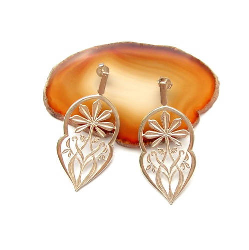 Wyjątkowe i niezwykle oryginalne kolczyki srebrne utrzymane w stylu etno, które zachwycają swoją subtelnością i finezją. Graficzny, roślinny wzór został misternie zamknięty w stylizowanej ramce, tworząc biżuterię pełną elegancji i wyrafinowanego piękna.