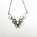 Centralnym punktem naszyjnika jest ozdobny element o imponujących wymiarach 6,5 cm na 4,8 cm, który został zawieszony na delikatnym łańcuszku. Całkowita długość naszyjnika wynosi 50 cm, co sprawia, że jest idealnym dodatkiem do każdej stylizacji, dodając jej elegancji i wyjątkowości.