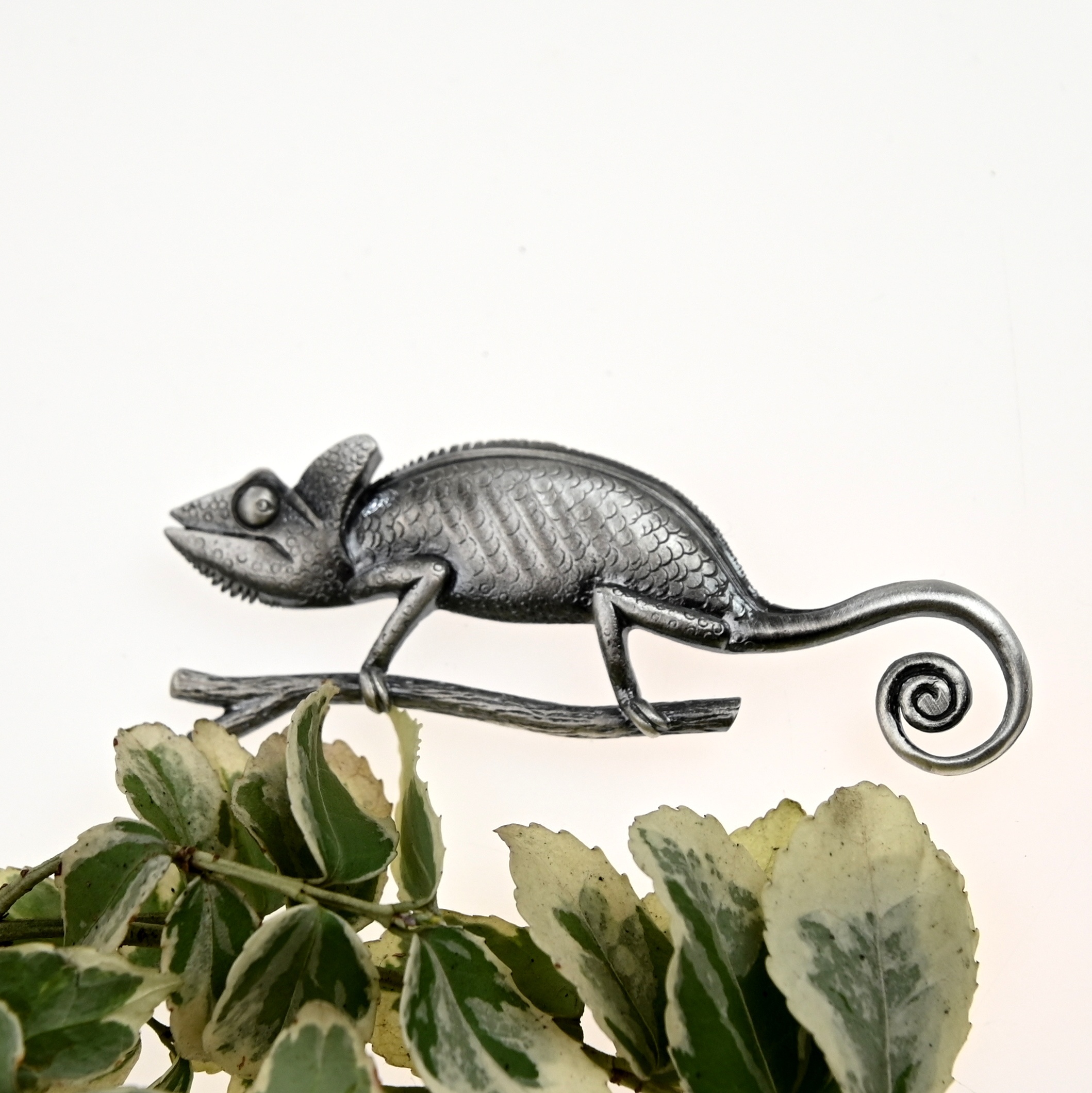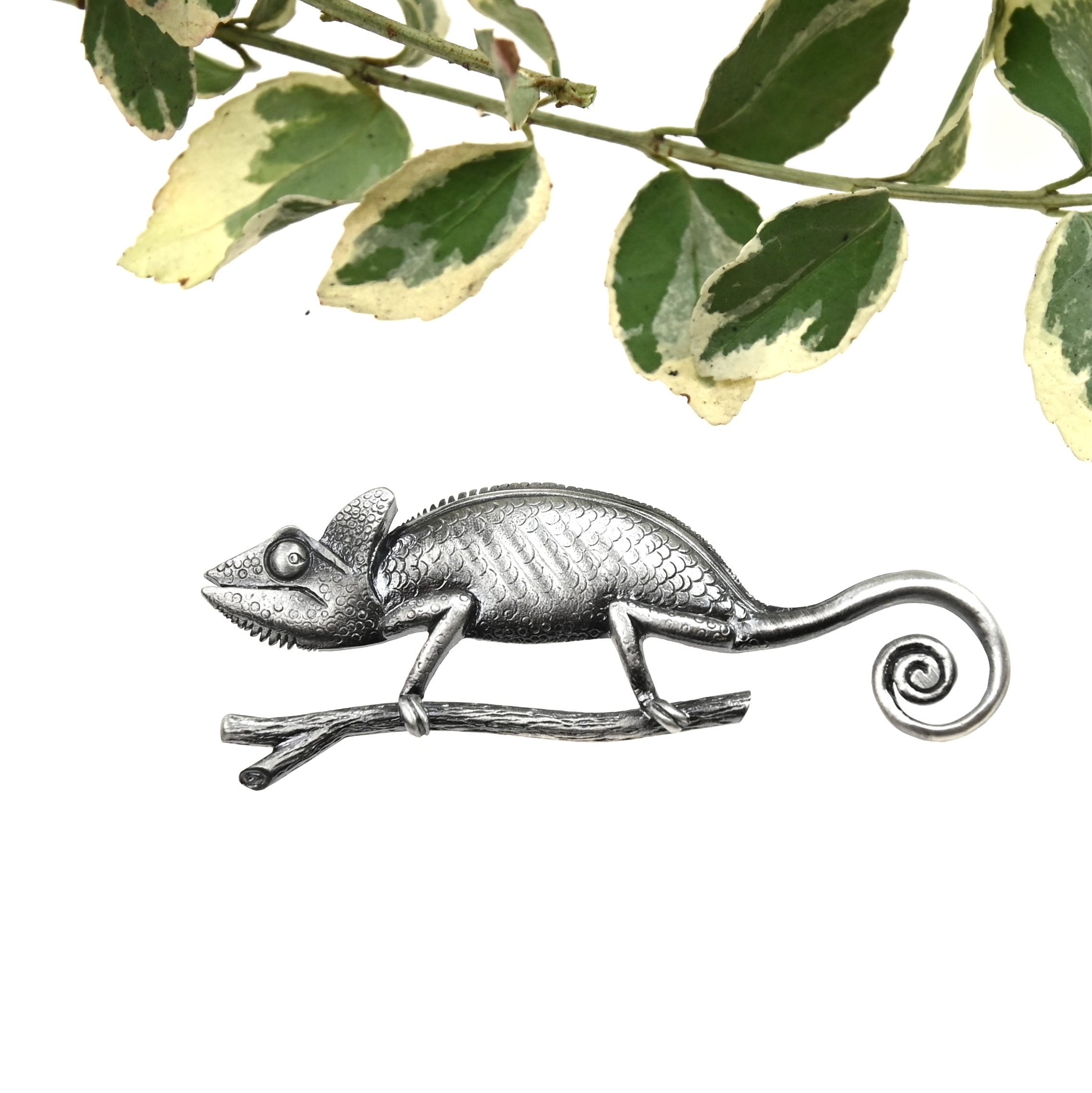 Broszka została wykonana ze srebra próby 925 i pokryta oksydą w eleganckim, szarym odcieniu. Takie wykończenie nadaje całości głębi oraz artystycznego charakteru, subtelnie podkreślając fakturę skóry kameleona, jego zawinięty ogon oraz delikatną gałązkę. Biżuteria zyskuje dzięki temu lekko vintage’owy klimat i doskonale wpisuje się w trend biżuterii inspirowanej naturą.