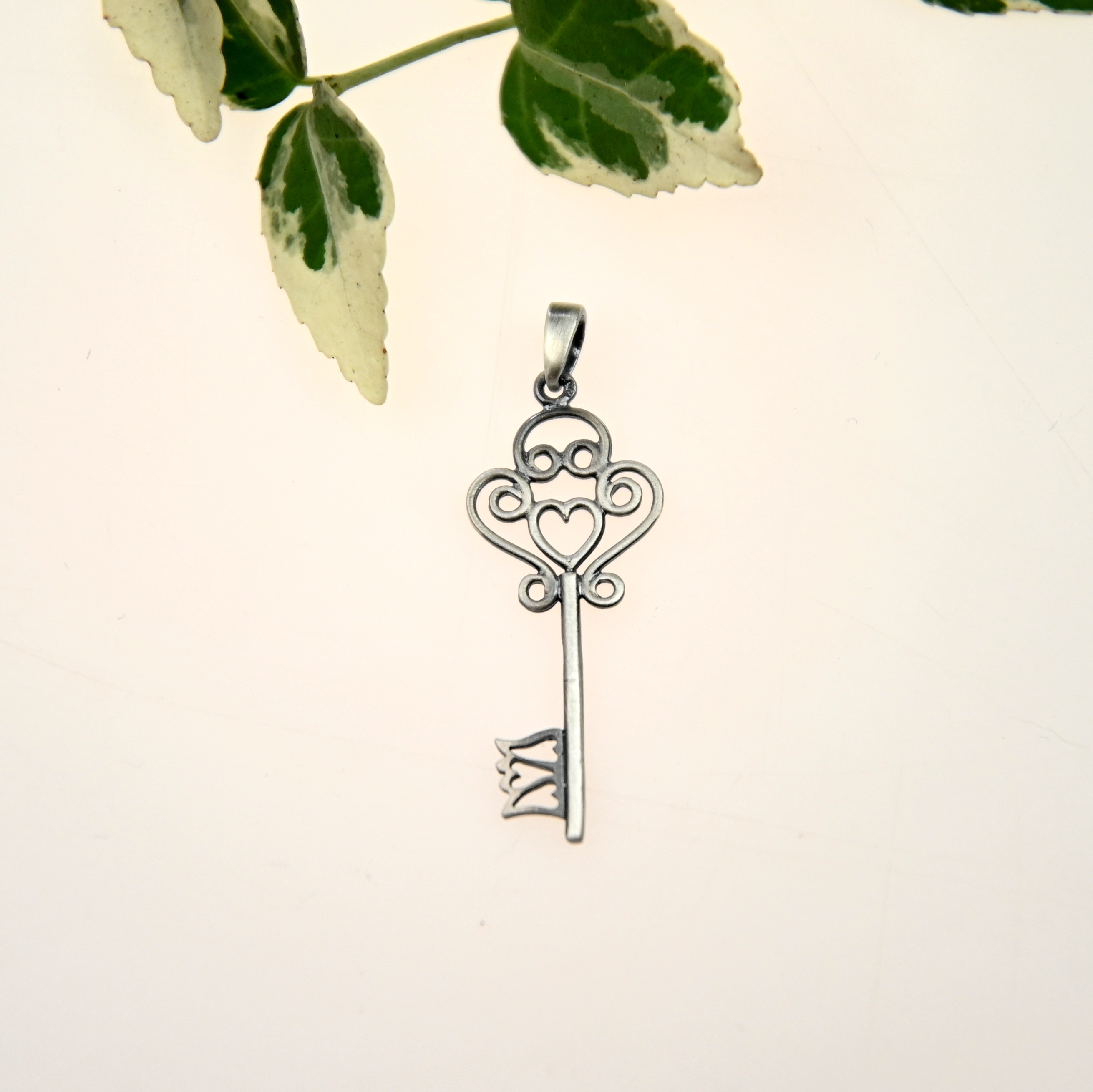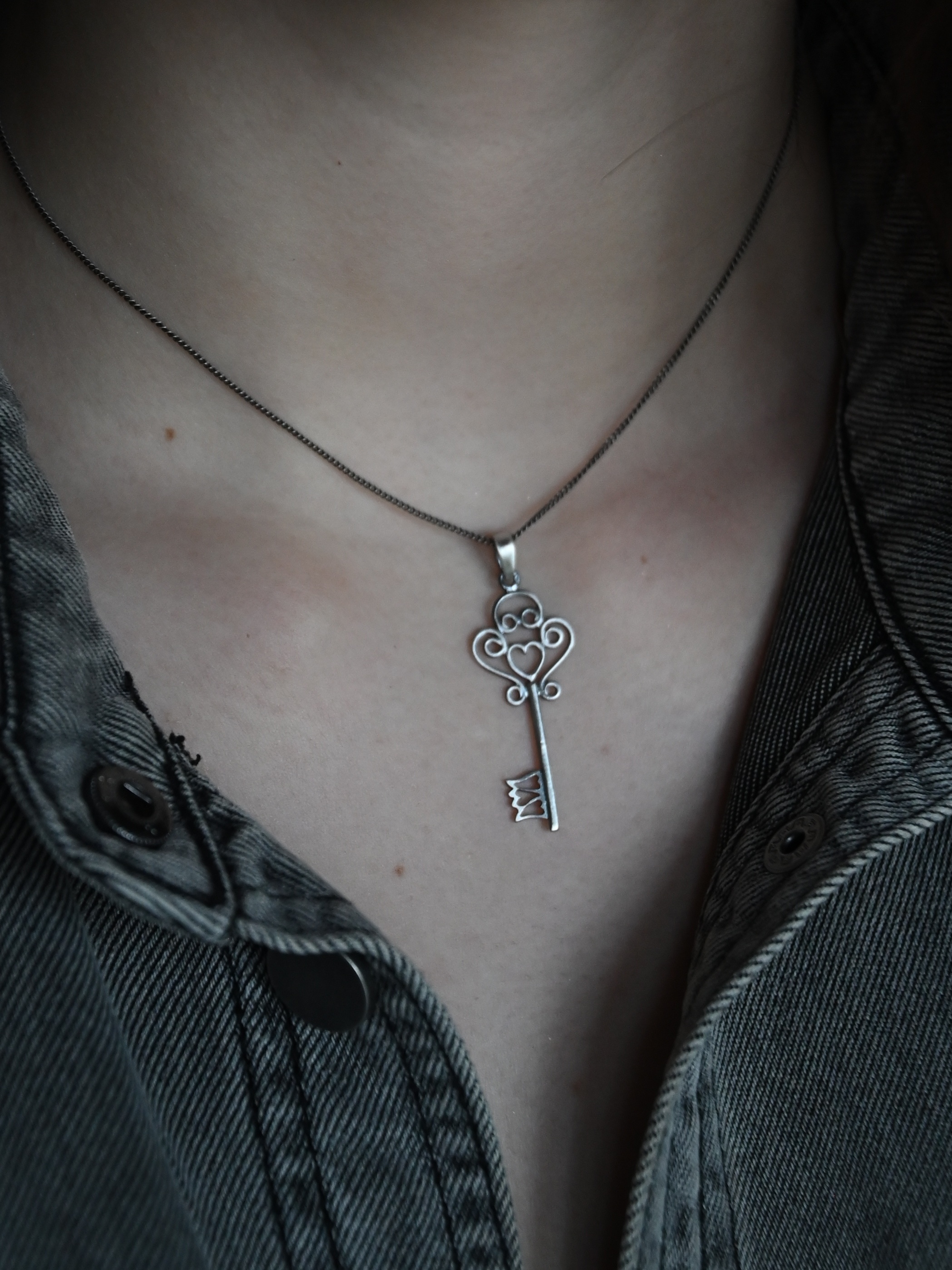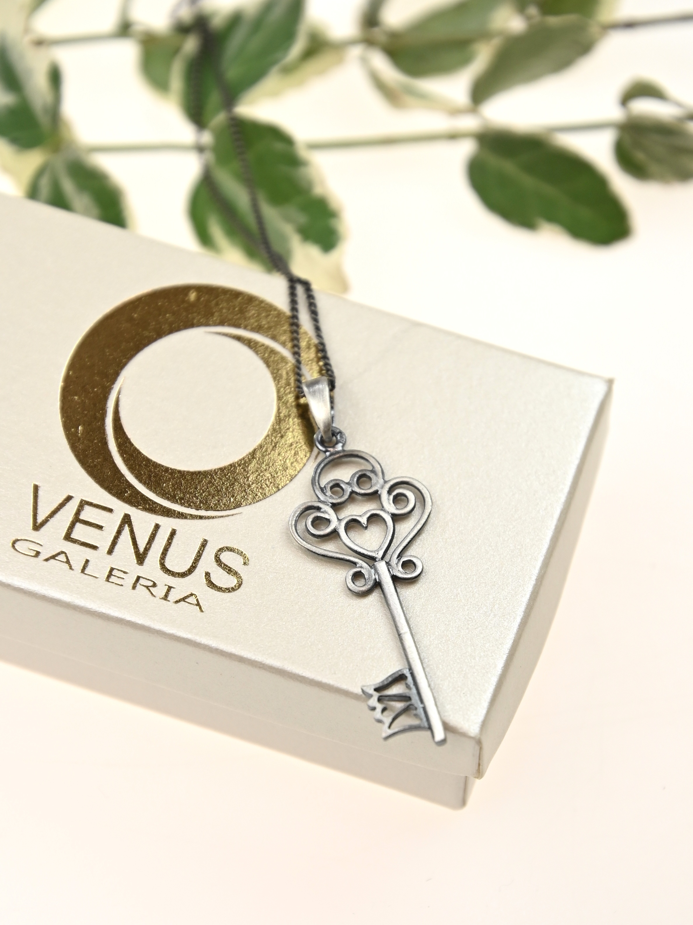Motyw klucza od dawna symbolizuje tajemnice, zaufanie, bliskość oraz dostęp do tego, co ukryte i najważniejsze. Oksydowane wykończenie sprawia, że kluczyk wygląda jak mały przedmiot z dawnych czasów, osobisty talizman noszony blisko serca. Dzięki niewielkim rozmiarom wisiorek jest lekki i wygodny w noszeniu, pięknie dopełniając codzienne stylizacje oraz bardziej romantyczne, wieczorne zestawy.