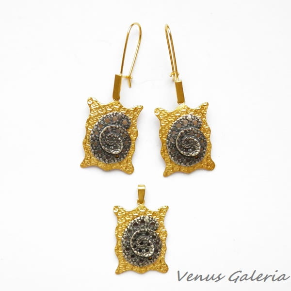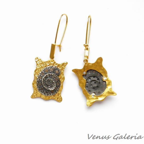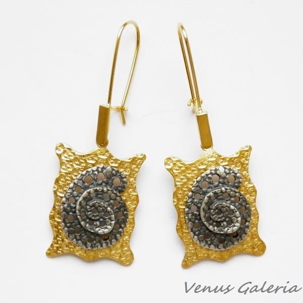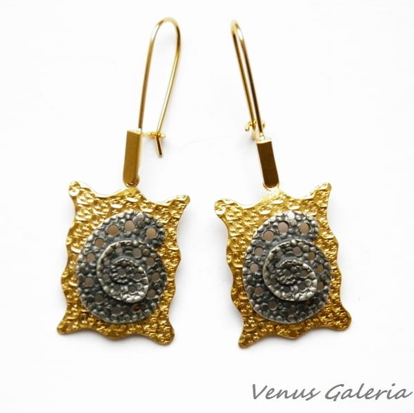Oryginalne kolczyki wykonane ze srebra, następnie pozłocone, element w środku zoksydowany.