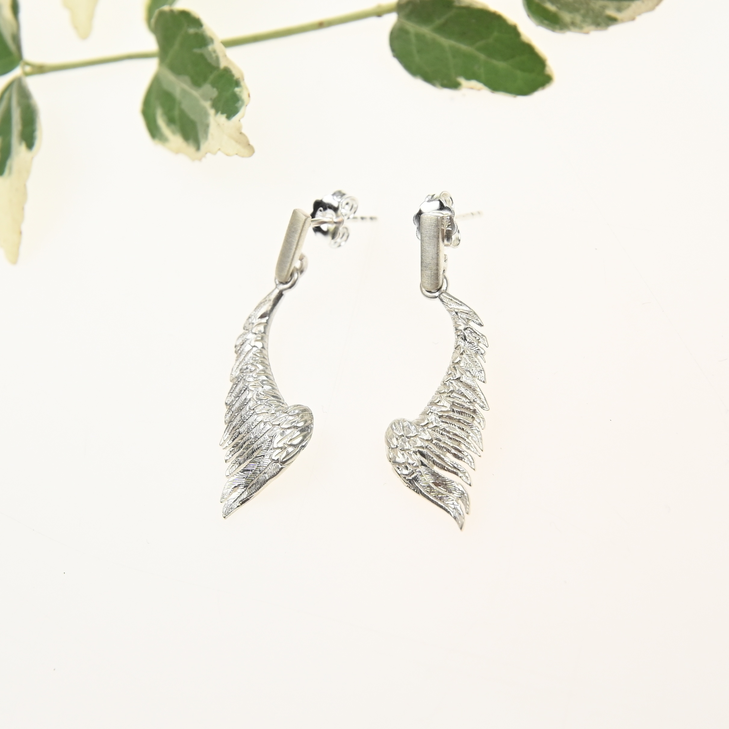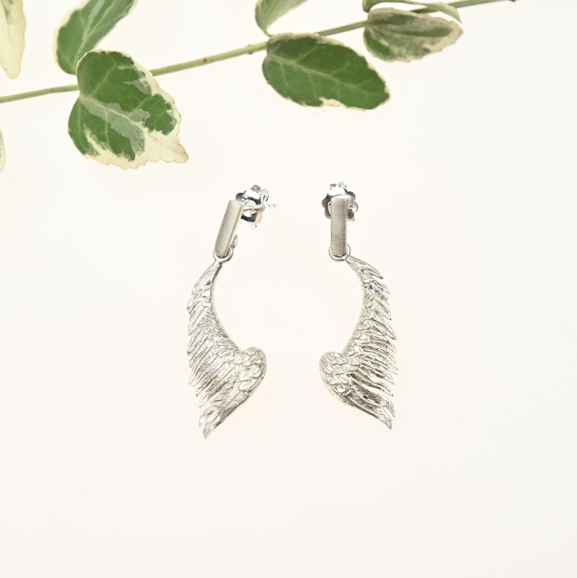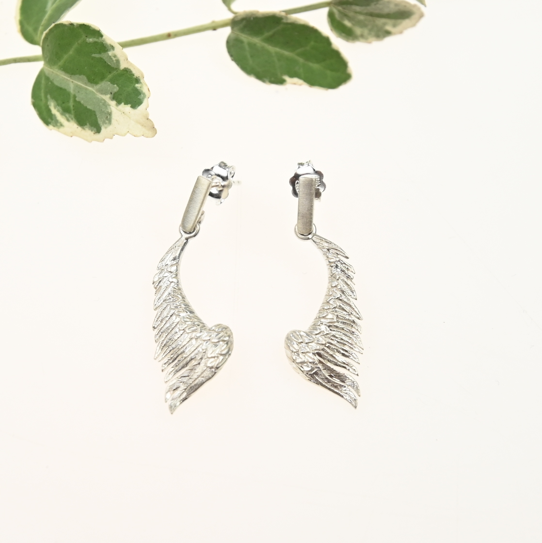 Srebrne kolczyki w kształcie skrzydeł anioła.