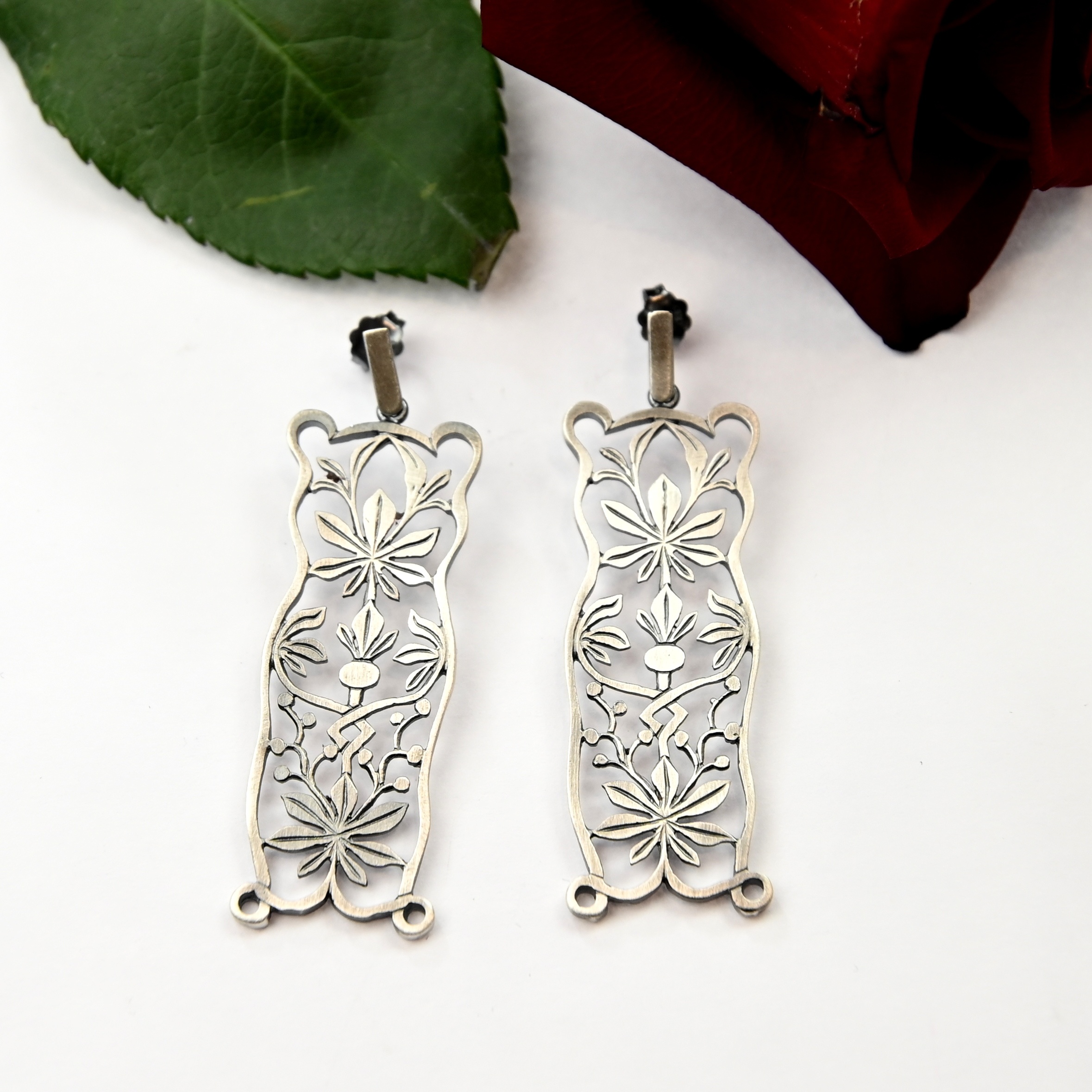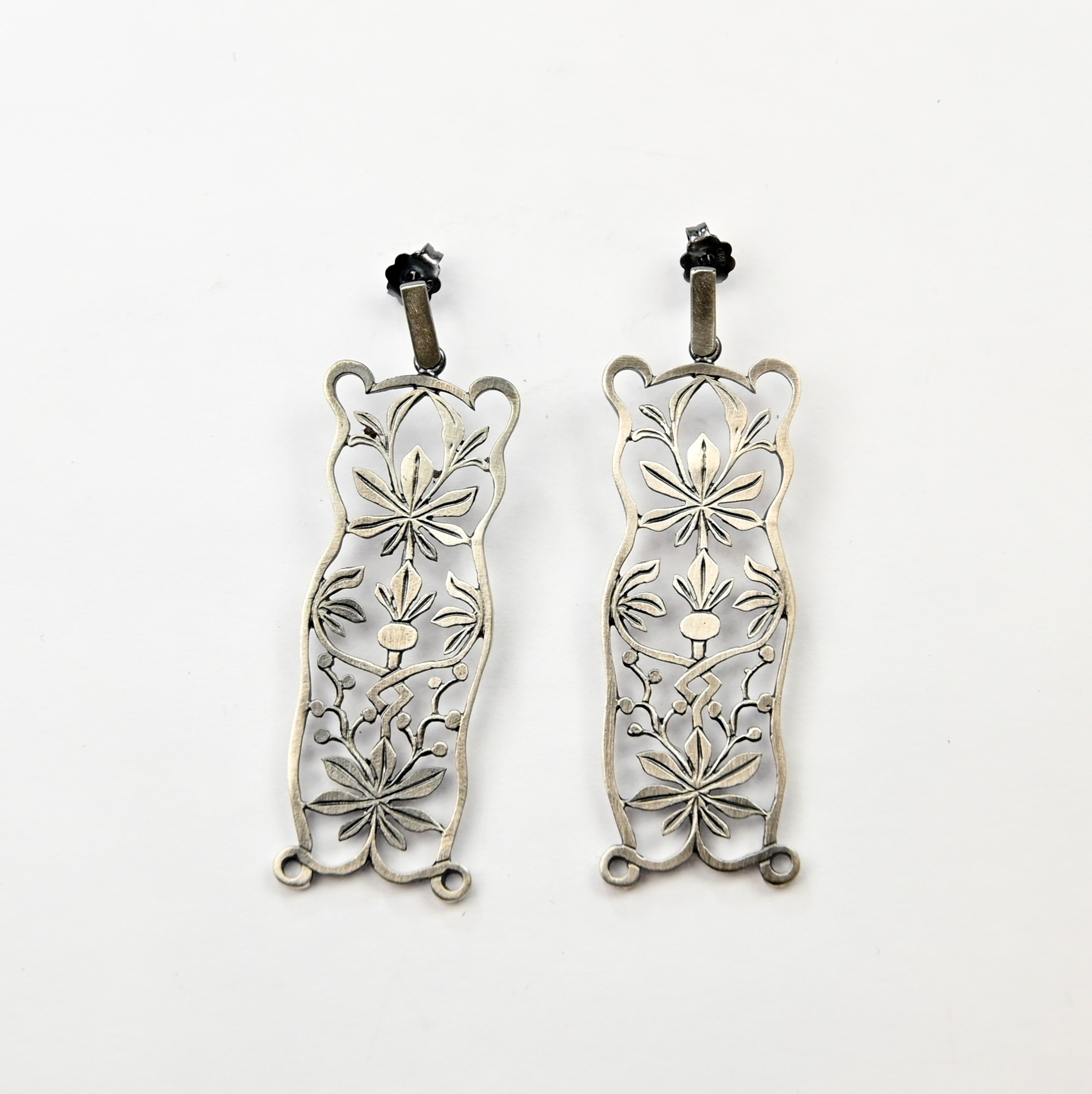 Misterne, delikatne kolczyki wykonane ze srebra, następnie zoksydowane i wypolerowane.