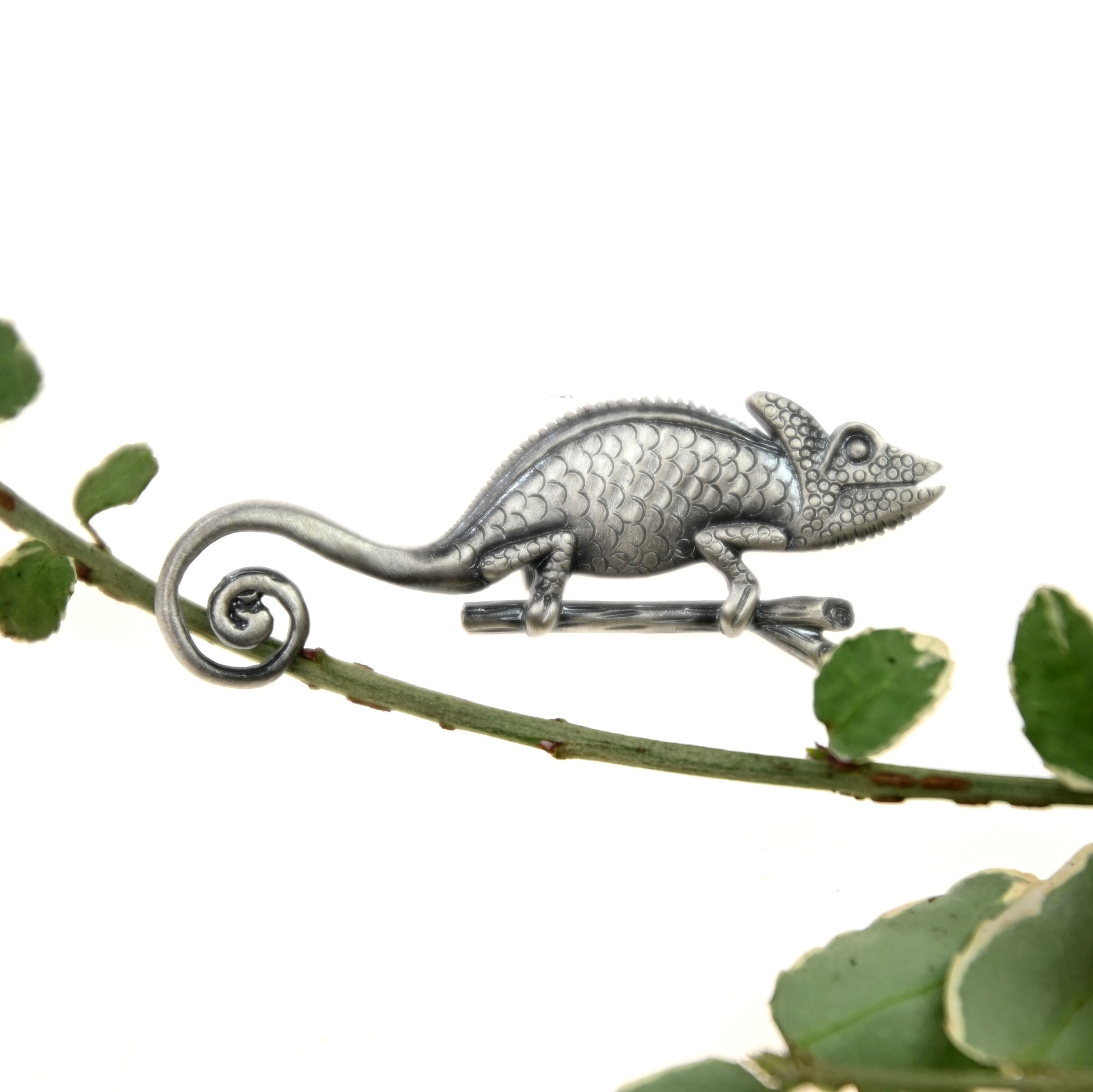 Urocza broszka srebrna kameleon szary to wyjątkowy dodatek dla osób ceniących oryginalną i artystyczną biżuterię. Przedstawia małego kameleona siedzącego na gałązce, starannie wykonana ze srebra próby 925 i pokryta oksydą w subtelnym szarym odcieniu, co podkreśla każdy detal figurki. Misternie wyrzeźbione elementy nadają broszce naturalistyczny charakter i wyjątkowy urok, który przyciąga wzrok.