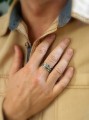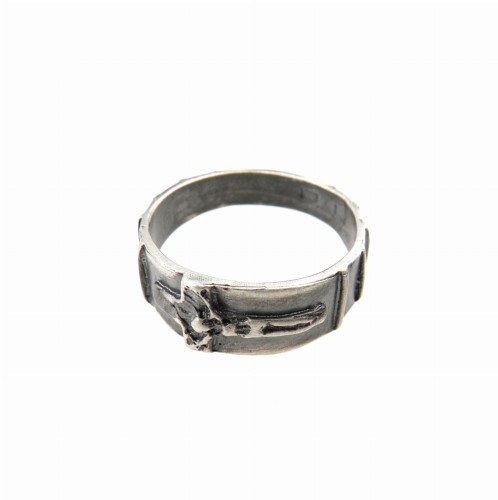 Piękna obrączka srebrna symbolizująca różaniec z uwidocznioną postacią ukrzyżowanego Jezusa.