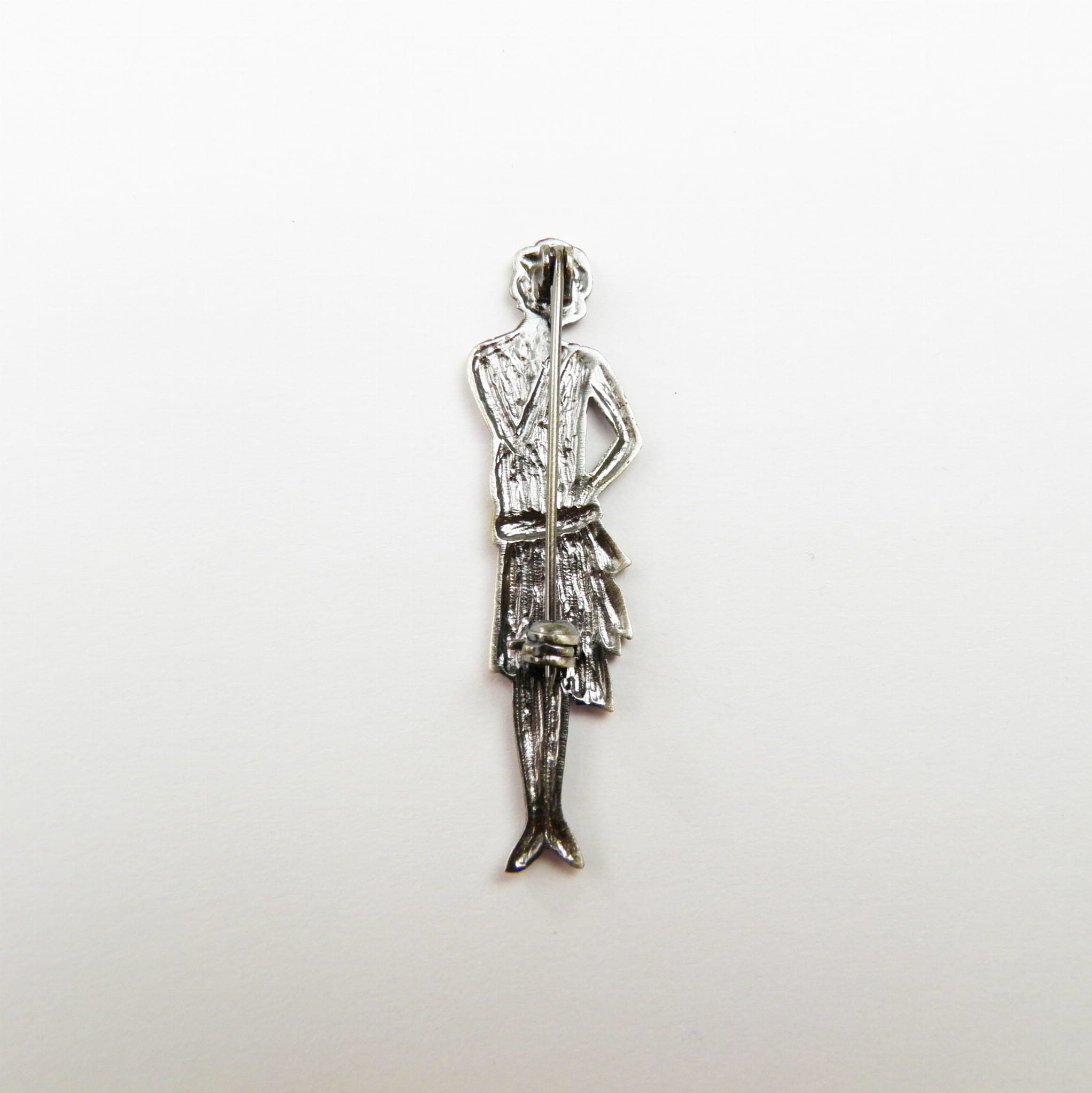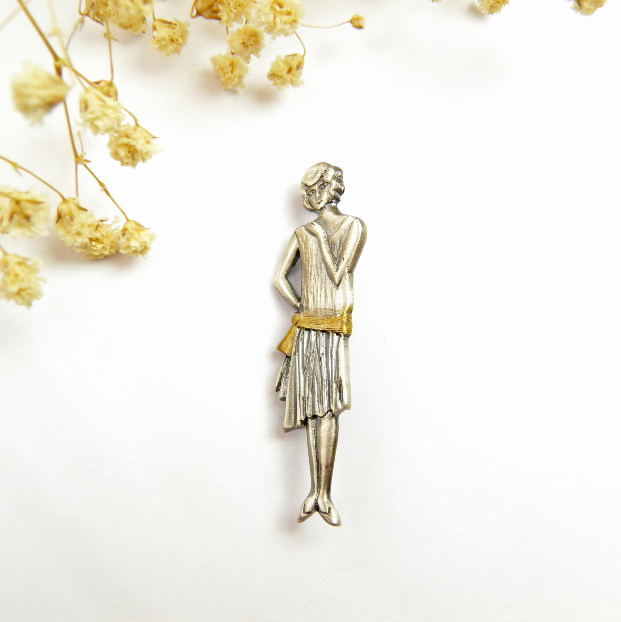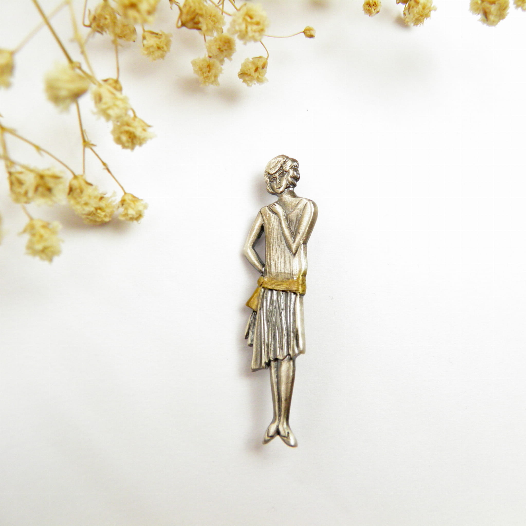 Urocza i niebanalna – broszka srebrna „Dama Retro” przedstawia kobietę w stylu lat 20-tych i 30-tych, łącząc klasykę z artystycznym wyrafinowaniem. Wykonana ręcznie ze srebra próby 925, z oksydowanym wykończeniem i złoconą szarfą na sukience, jest subtelnym hołdem dla elegancji minionych dekad.