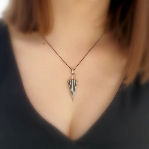 Zabawny wisiorek w kształcie parasolki, wykonany z oksydowanego srebra.