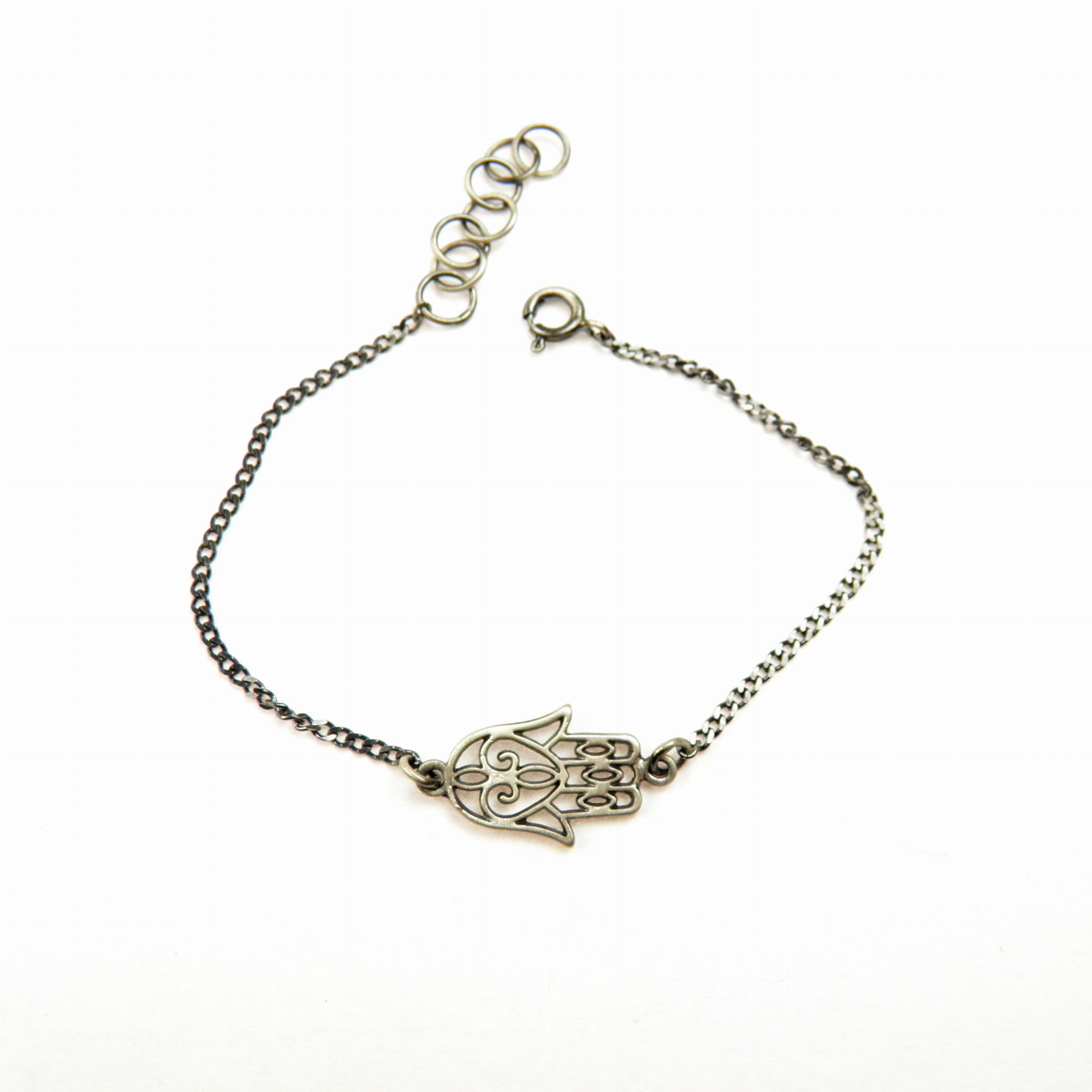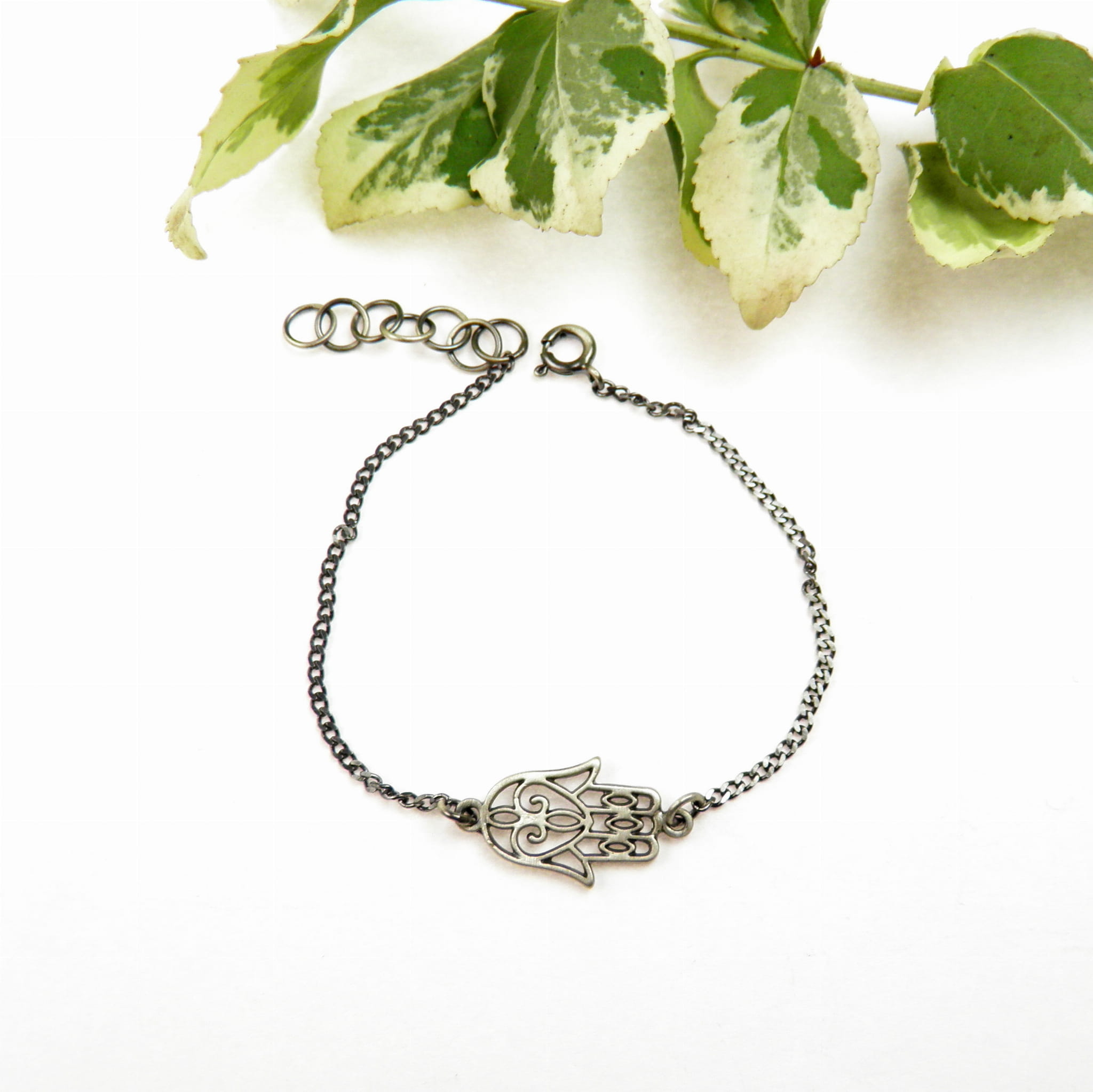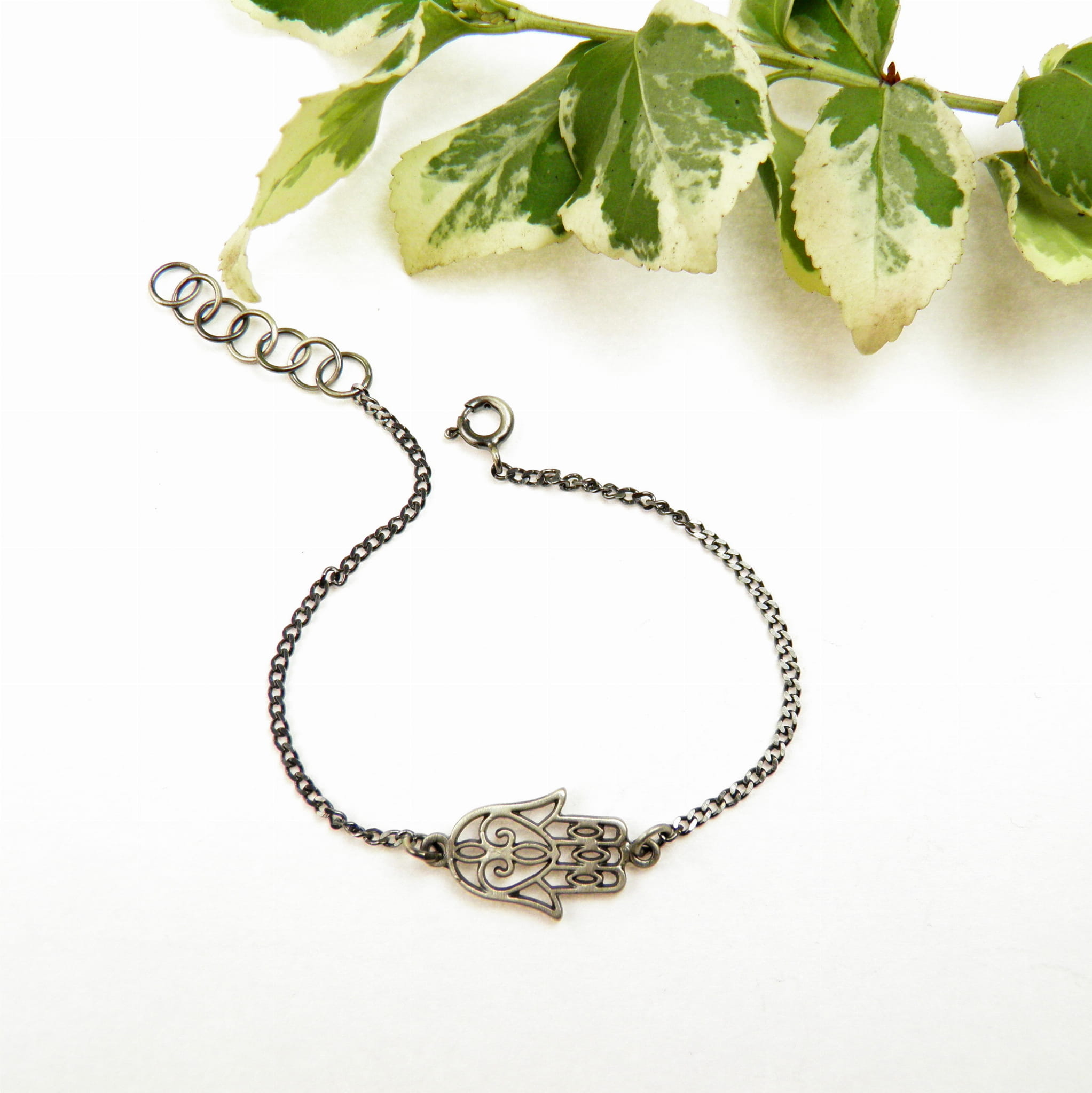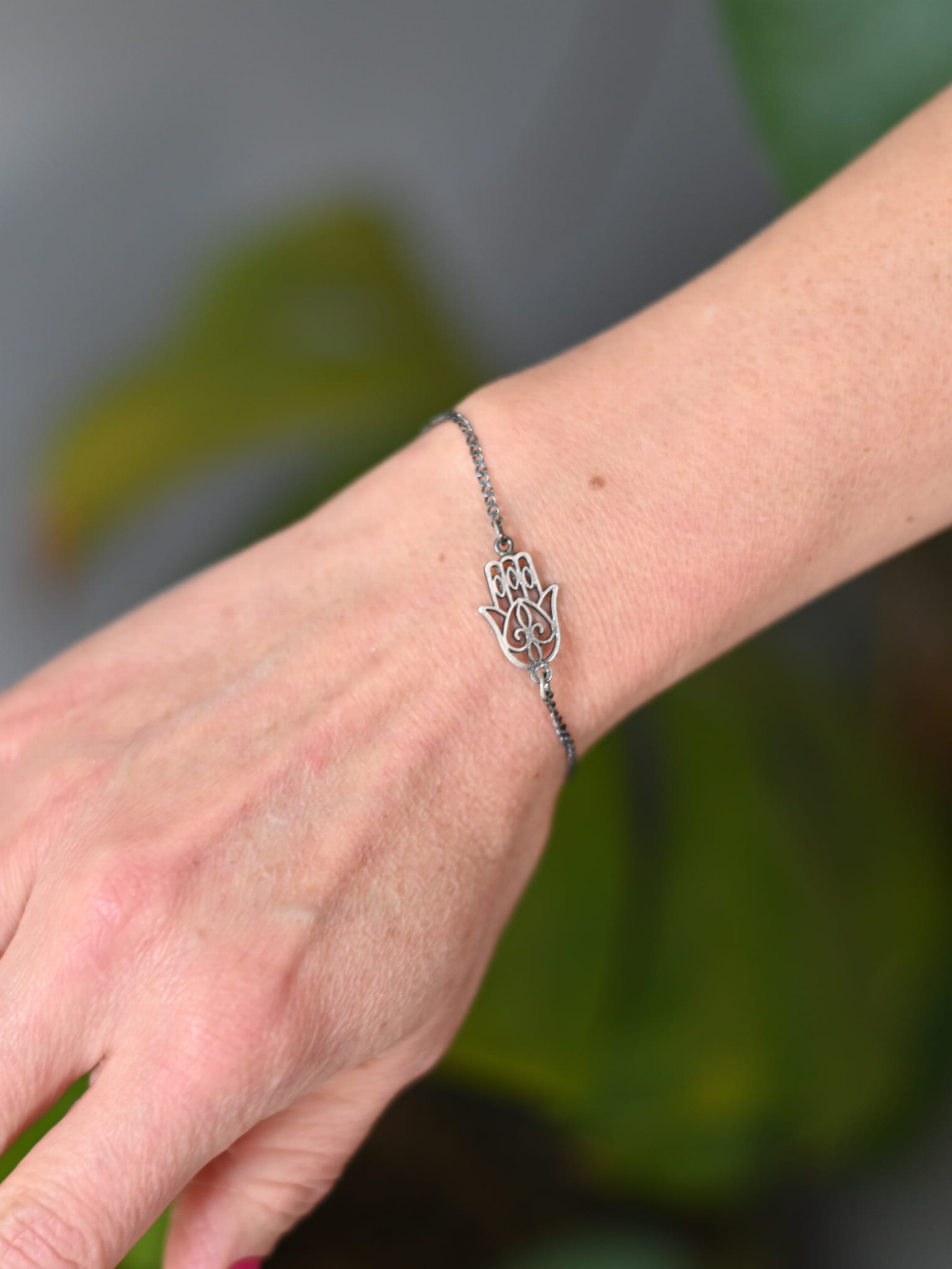 Bransoletka, która łączy w sobie zarówno elegancję, jak i duchową moc – Ręka Fatimy, symbol ochrony przed „złym okiem” oraz źródłem siły i harmonii. Ta wyjątkowa biżuteria została stworzona z srebra próby 925 i wykończona oksydą w kolorze grafitowym, nadając jej głęboki, subtelny odcień. Jest to doskonały wybór dla osób poszukujących zarówno piękna, jak i symbolicznego znaczenia w biżuterii.