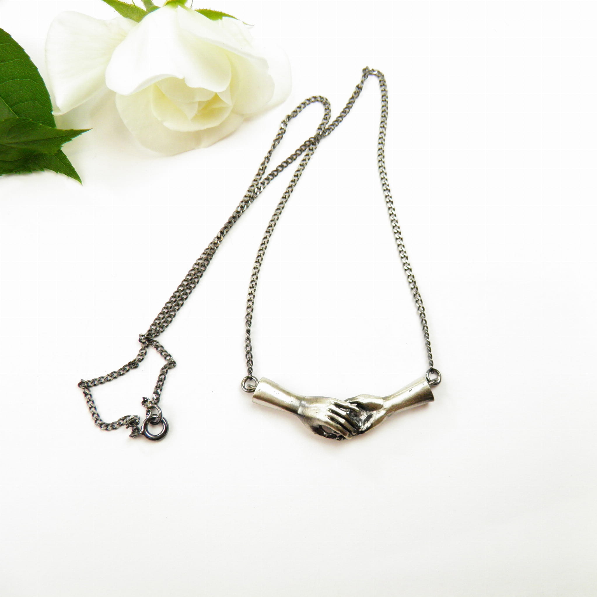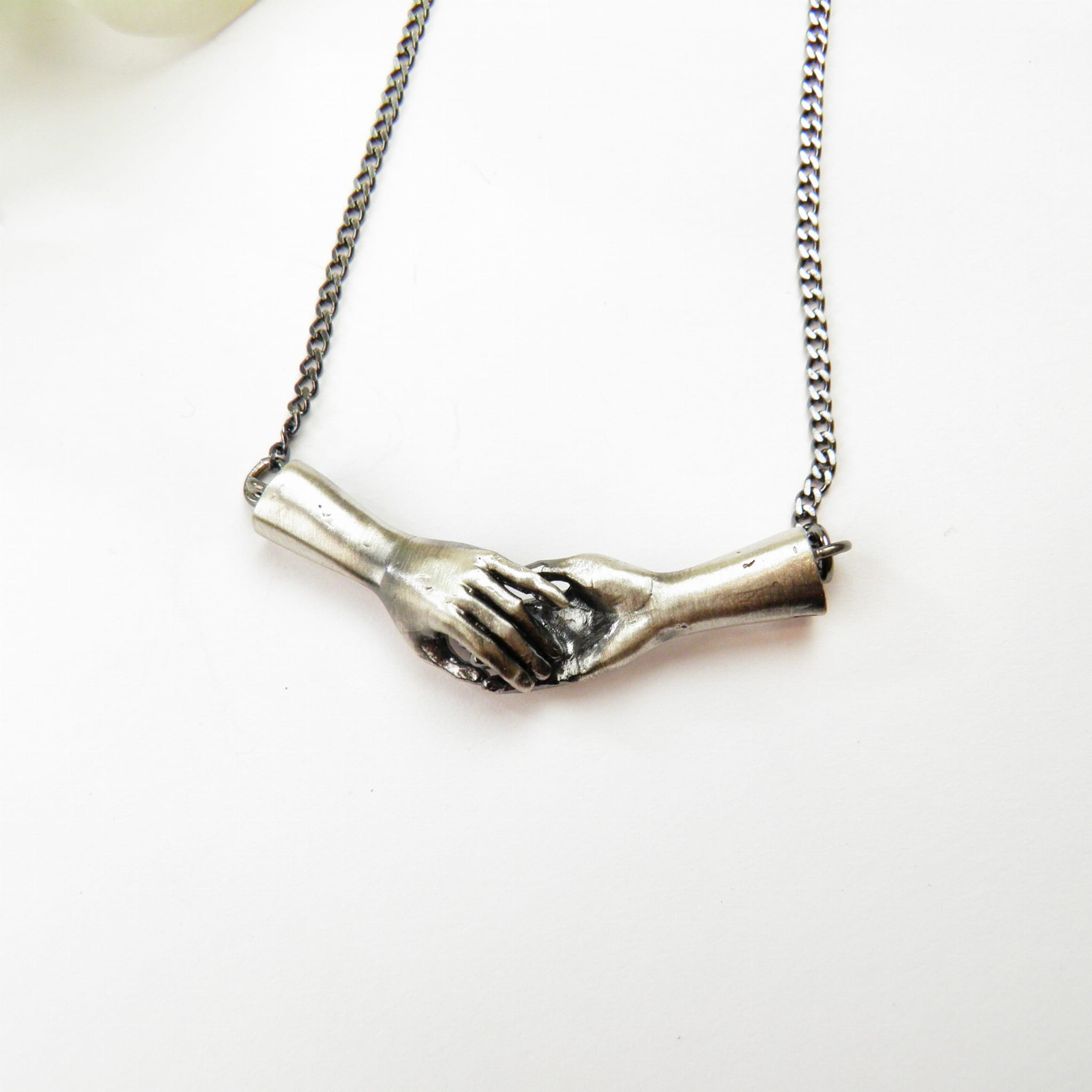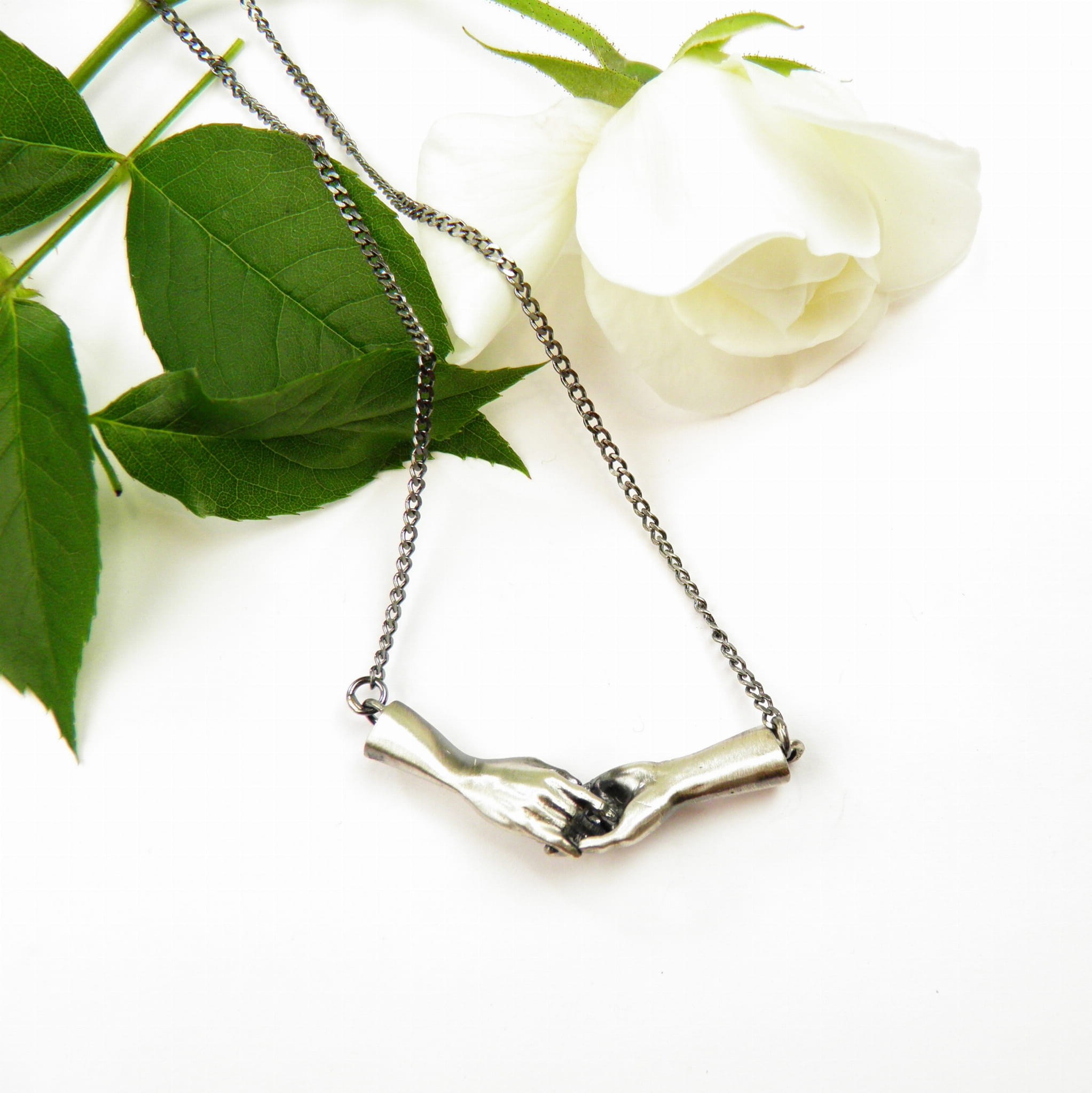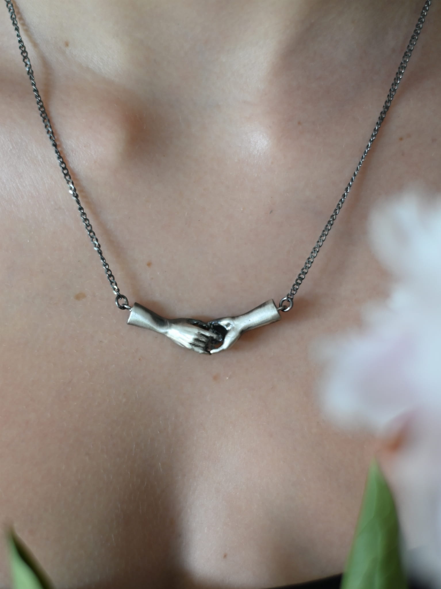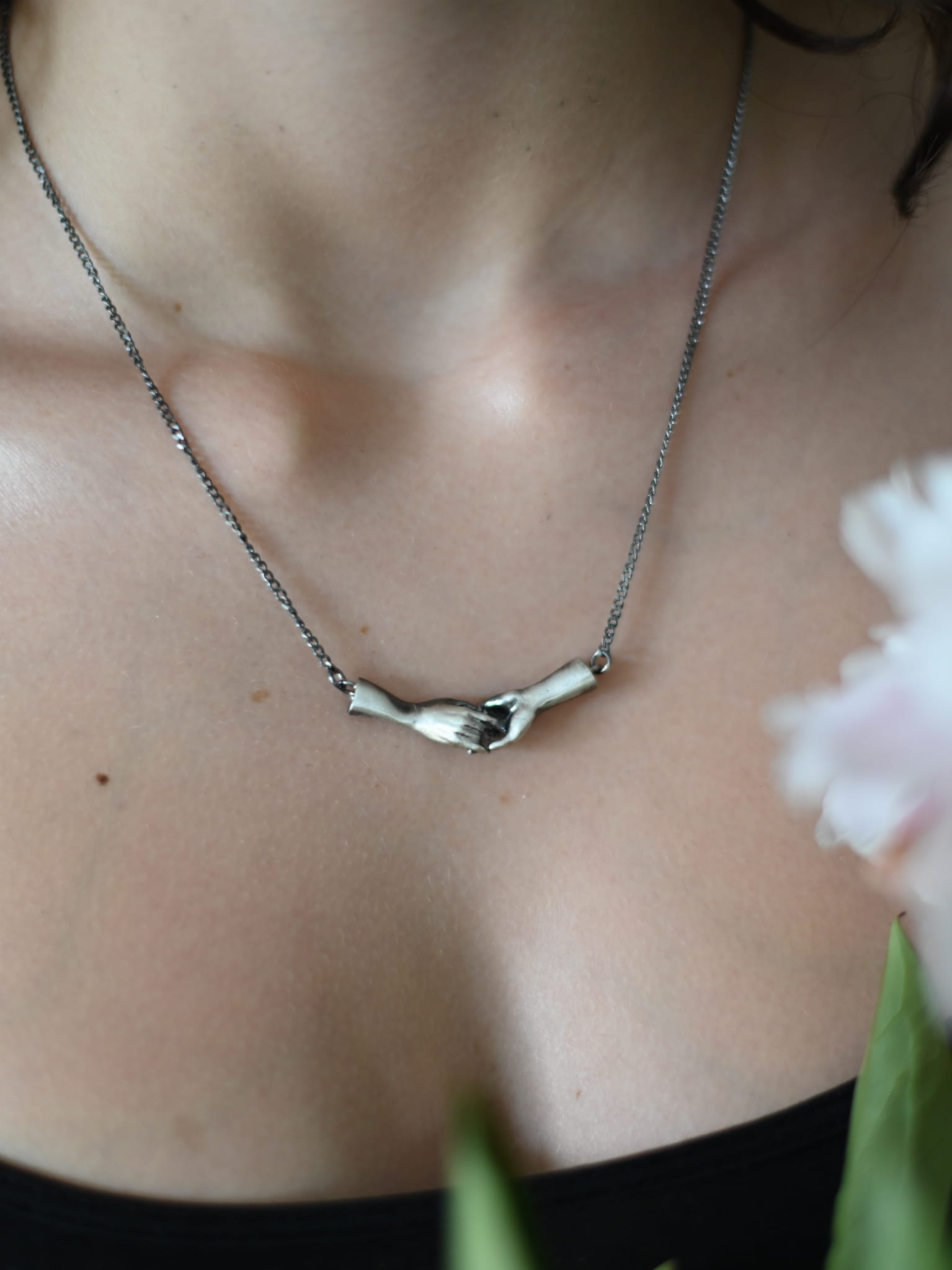 Ten wyjątkowy naszyjnik z zawieszką w kształcie splecionych dłoni to połączenie delikatnej formy z głębokim przesłaniem.