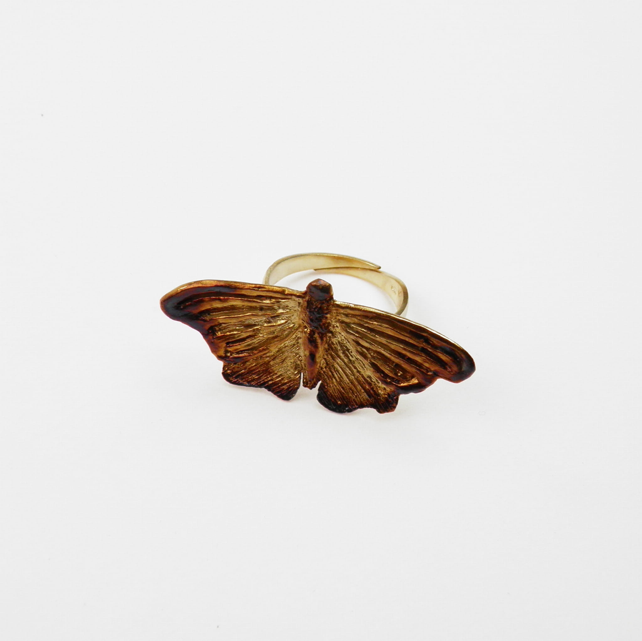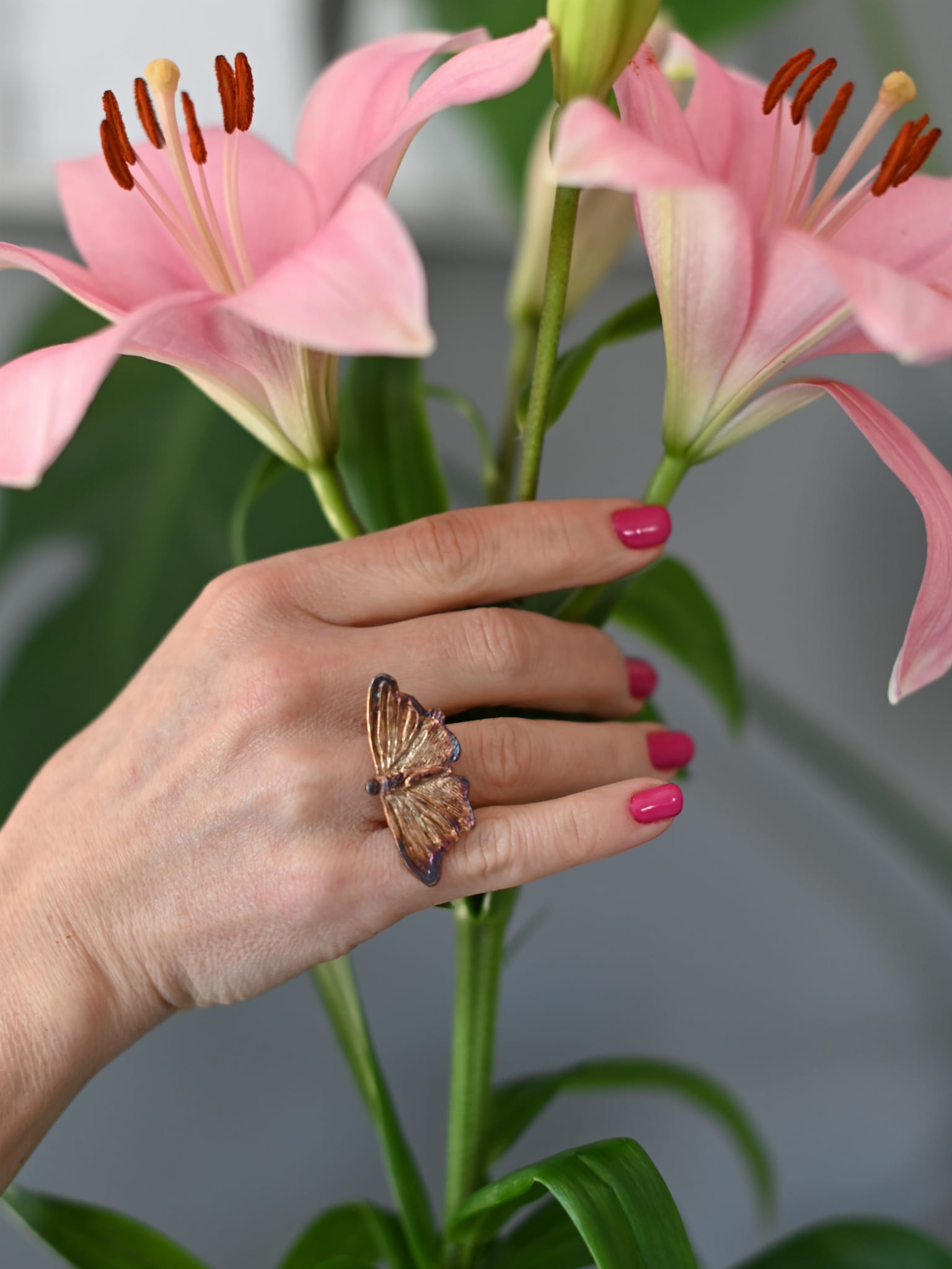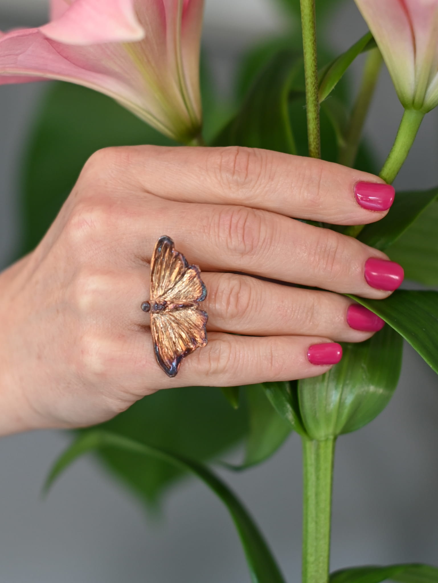 Srebrna ćma (próba 925), będąca sercem kompozycji, ma wymiary 4,2 cm na 2 cm i została osadzona na wygodnej, regulowanej obrączce, dzięki czemu pierścionek z łatwością dopasowuje się do różnych rozmiarów palców. Idealnie leży, nie uciska, a jednocześnie przyciąga spojrzenia jak biżuteryjna opowieść utkane ze snu.
