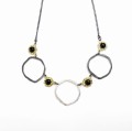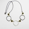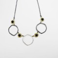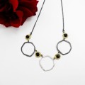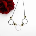 Każdy onyks, osadzony w złotej ramie, jest jak mały kawałek nocnego nieba, a srebrne kręgi, którymi są przeplatane, dodają eleganckiego kontrastu i subtelnego blasku. Oksydowany łańcuszek, na którym zawieszono ten zmysłowy klejnot, tworzy harmonijną kompozycję z całością, tworząc elegancki akcent, który przyciąga spojrzenia.