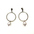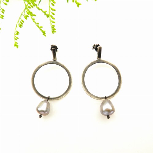 Kolczyki srebrne w kształcie kół na których zawieszone zostały duże, naturalne, szare perły.