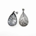 Eleganckie kolczyki wykonane ze srebra próby 925 w kształcie łezki misternie zdobionej wyszukaną ornamentyką.