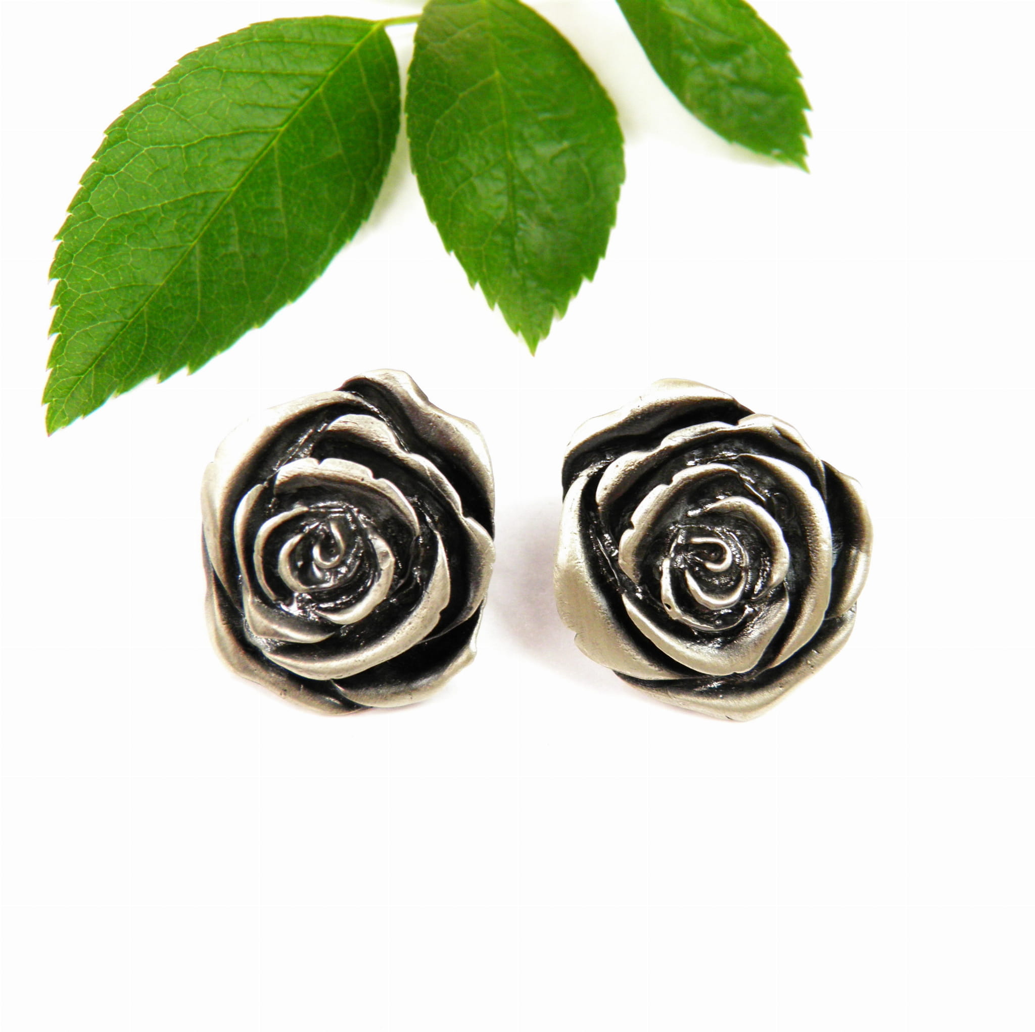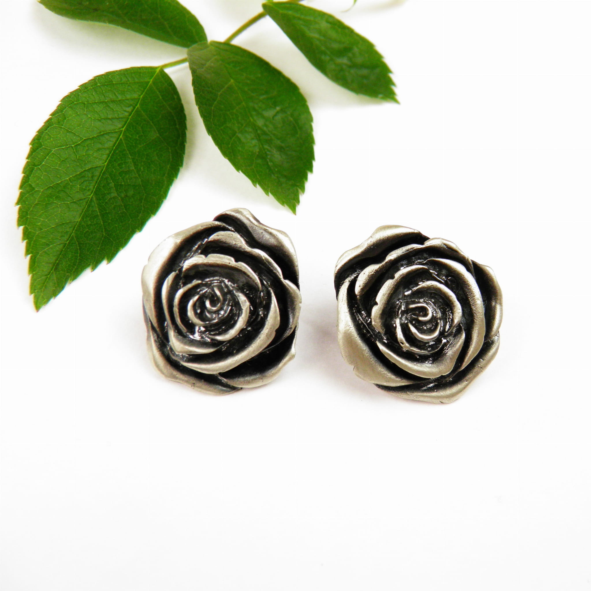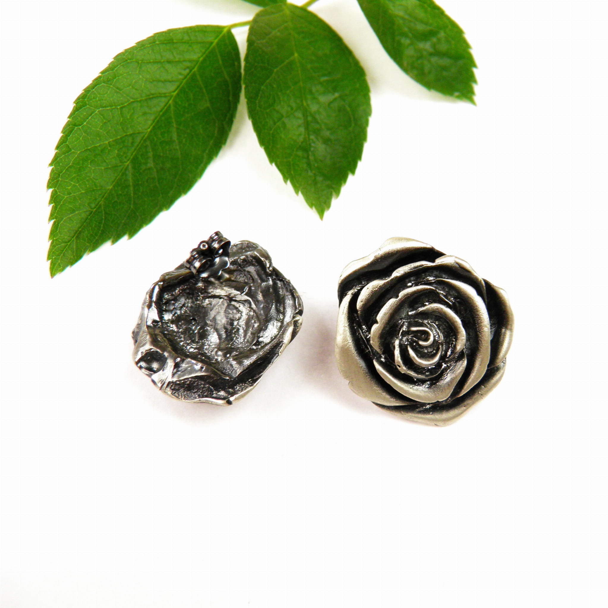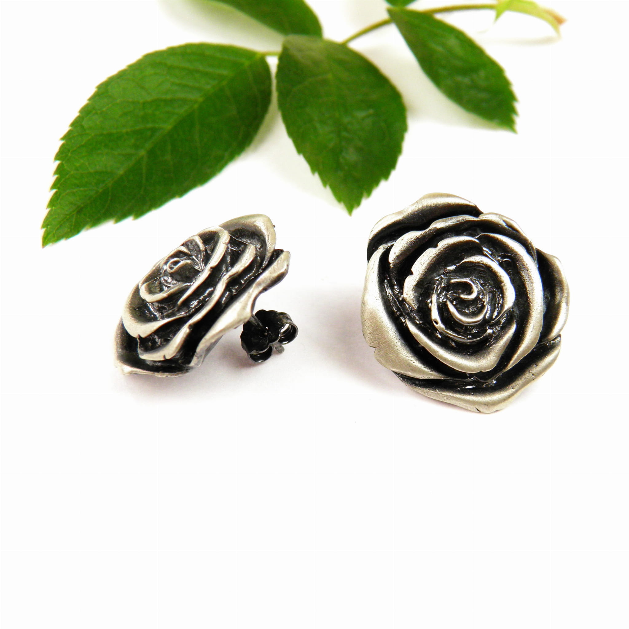 Odkryj wyjątkowe piękno srebrnych kolczyków w kształcie róż, które zachwycają formą, detalem i głębią koloru. Te okazałe, ręcznie wykończone kolczyki srebrne to doskonałe połączenie klasycznej symboliki róży z nowoczesnym, artystycznym wyrazem. Wykonane ze srebra próby 925 i poddane procesowi oksydacji, zyskały efekt szlachetnego przyciemnienia, który subtelnie wydobywa każdy detal płatków i nadaje całości charakteru vintage.