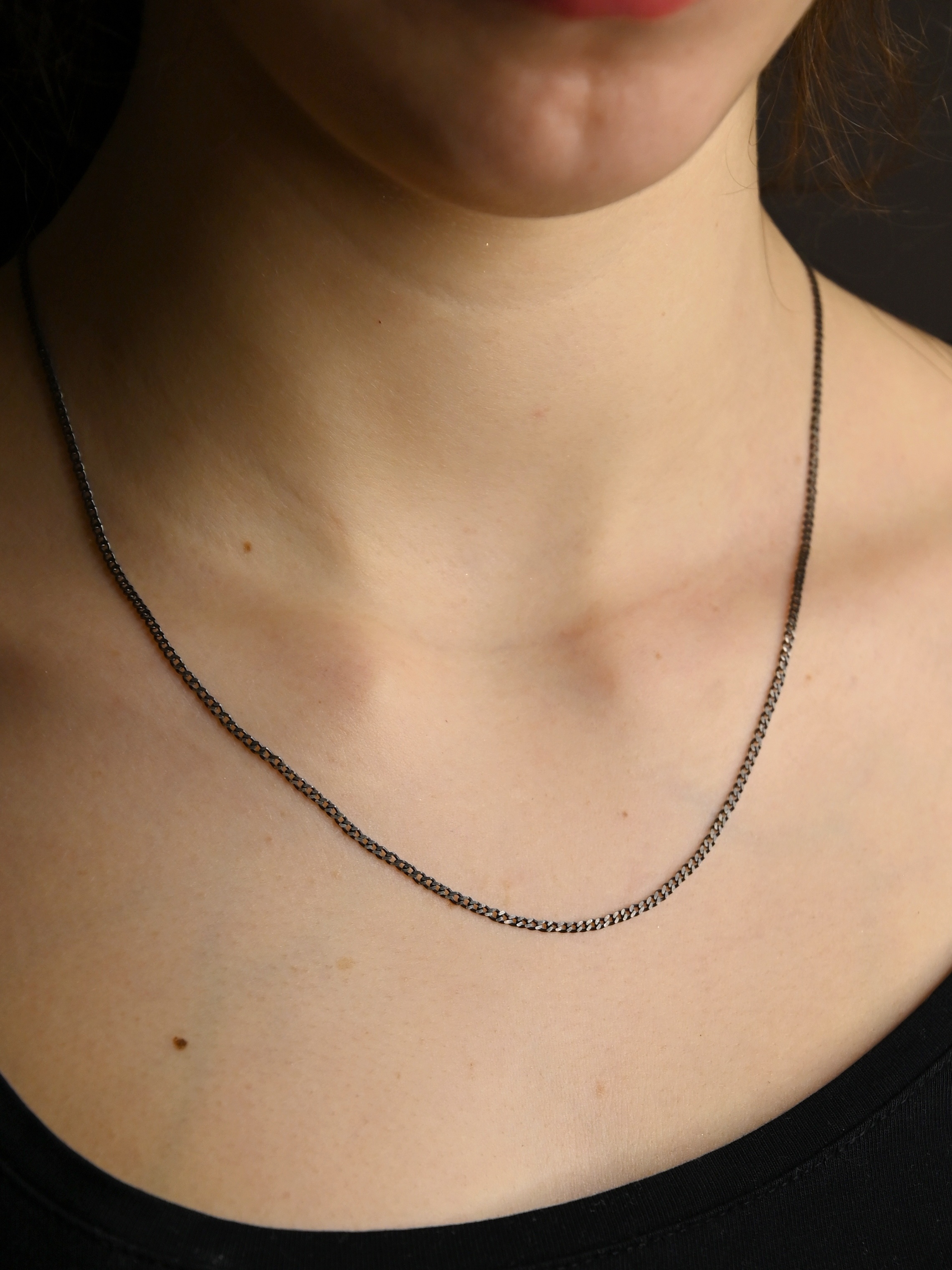 Łańcuszek wykończony oksydą, która nadała mu grafitowy odcień, przez co idealnie pasuje do wyrobów wykończonych w ten sam sposób.