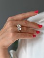 Ten delikatny i uroczy pierścionek to prawdziwy hołd dla natury, ozdobiony dwoma misternie wykonanymi kwiatuszkami niezapominajki. W samym sercu każdego z tych subtelnych kwiatków osadzona została mała cyrkonia, która niczym kropla porannej rosy, dodaje całości delikatnego blasku i elegancji.