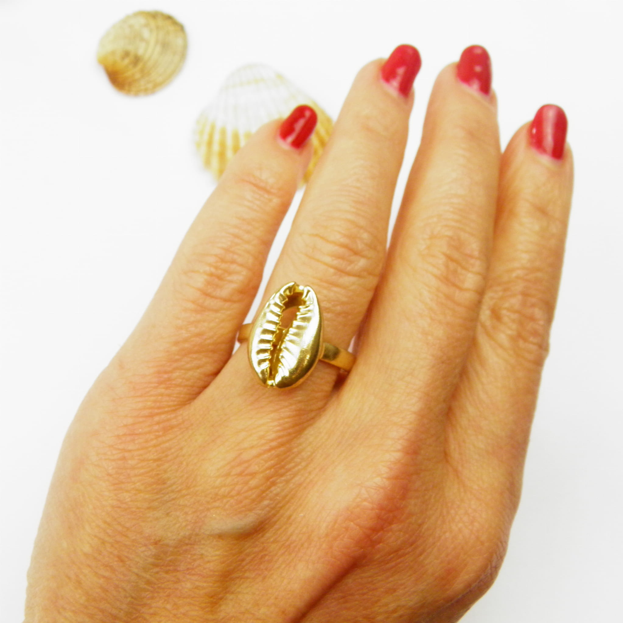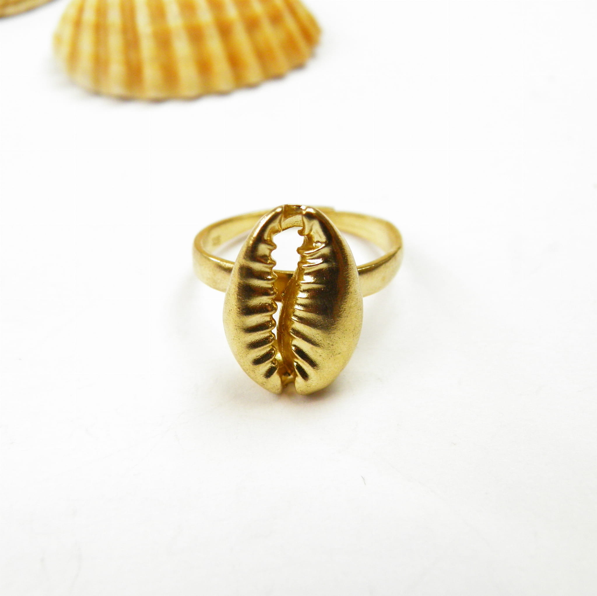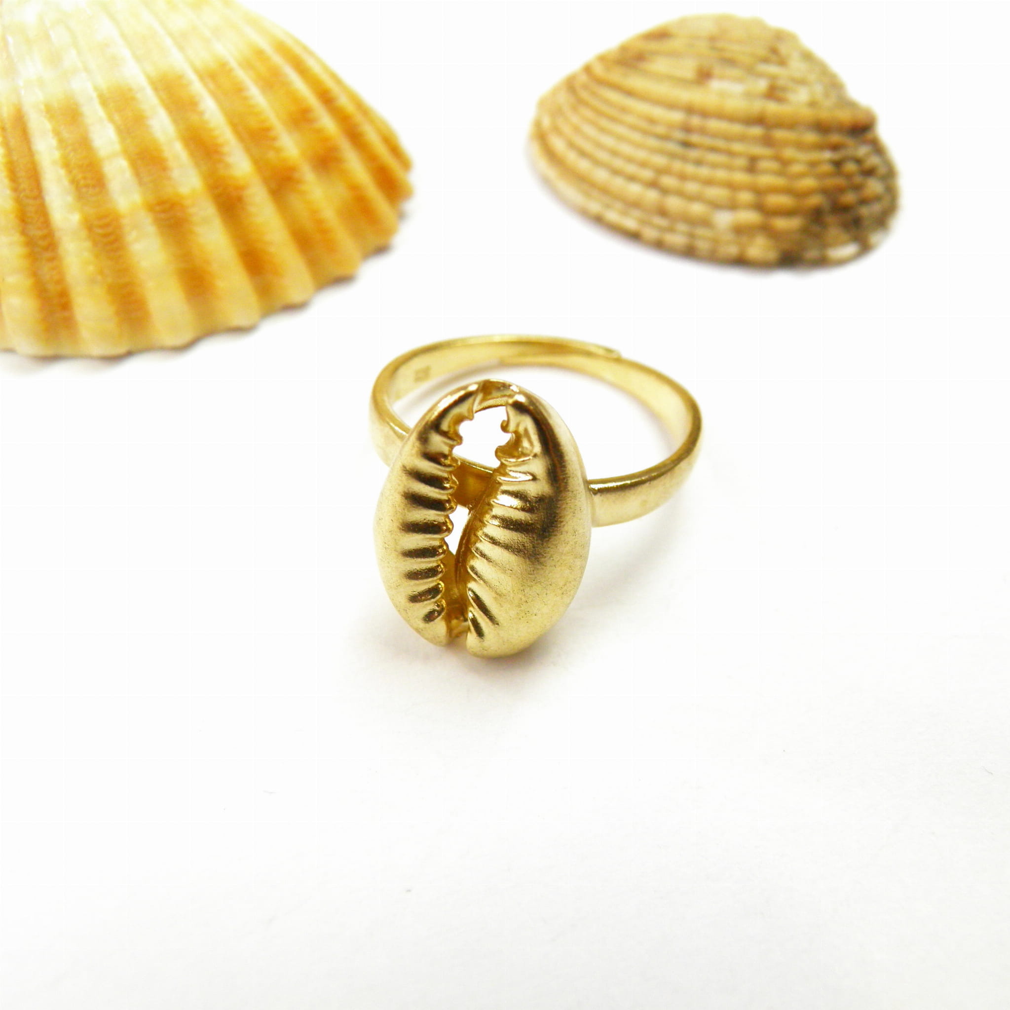 Pierścionek srebrny pozłacany z muszelką kauri - Urok natury zamknięty w biżuterii