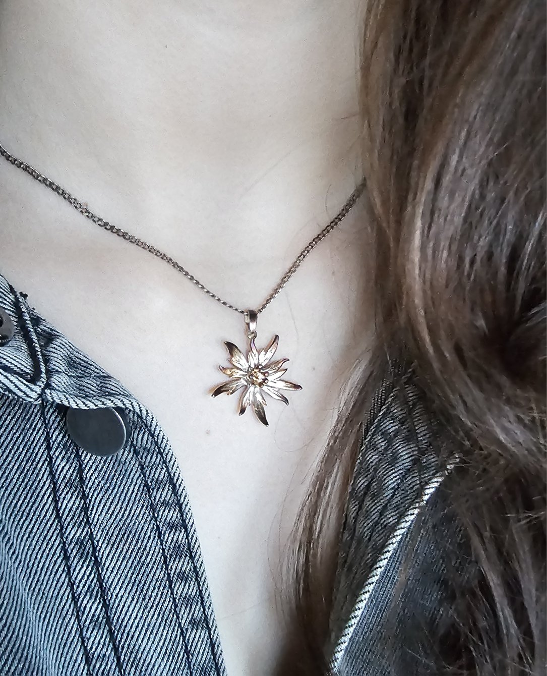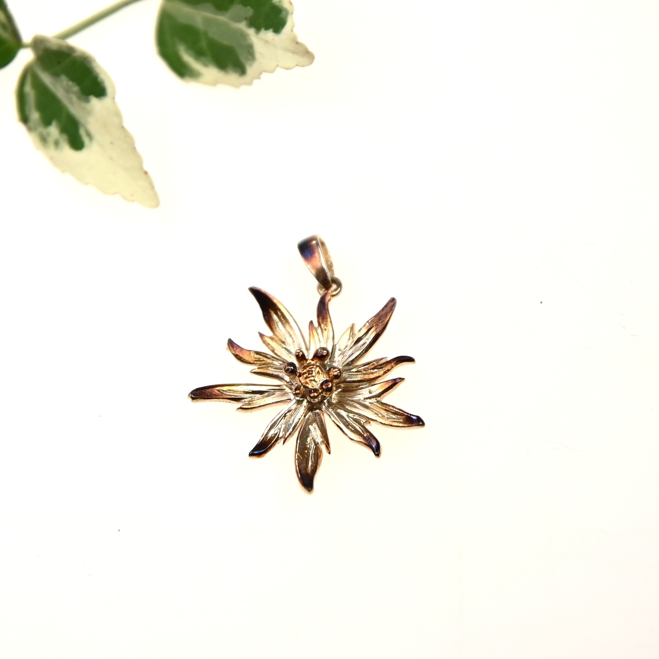 Srebrna zawieszka w kształcie górskiej szarotki to subtelny ukłon w stronę natury i jej dzikiego, nieoswojonego piękna. Wykonana ze srebra próby 925 i wykończona oksydą w odcieniu brązowo złotym, zachwyca ciepłą tonacją i delikatnie podkreślonymi detalami płatków.