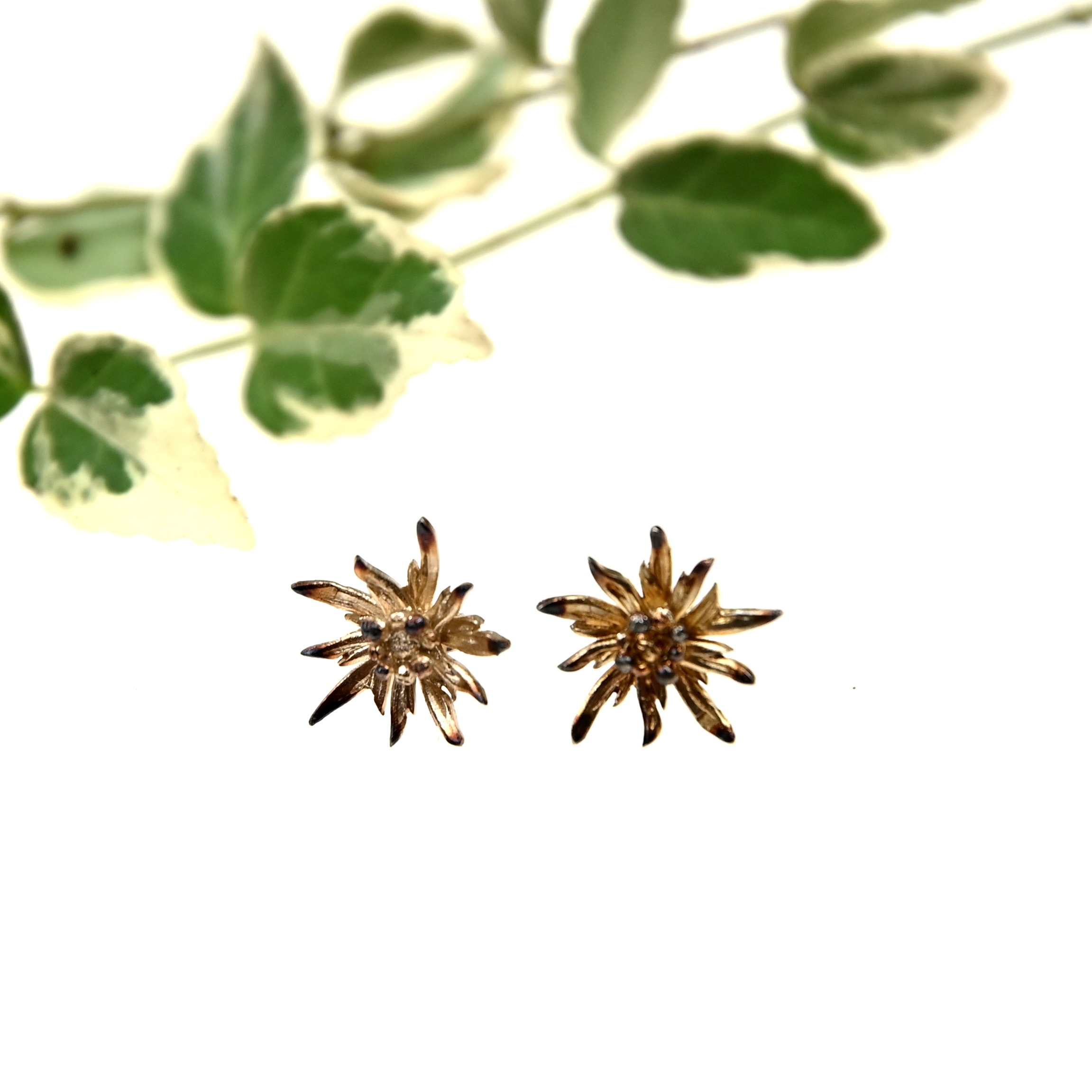 Kolczyki są wykończone oksydą w pięknym brązowo-złotym kolorze, co nadaje im wyjątkowy charakter i delikatny, rustykalny wygląd. Ta subtelna kolorystyka doskonale komponuje się z motywem górskiej szarotki, tworząc niepowtarzalną biżuterię.
