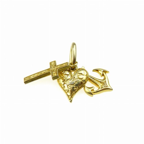 Srebrny wisiorek składający się z trzech elementów: serca, kotwicy i krzyżyka.