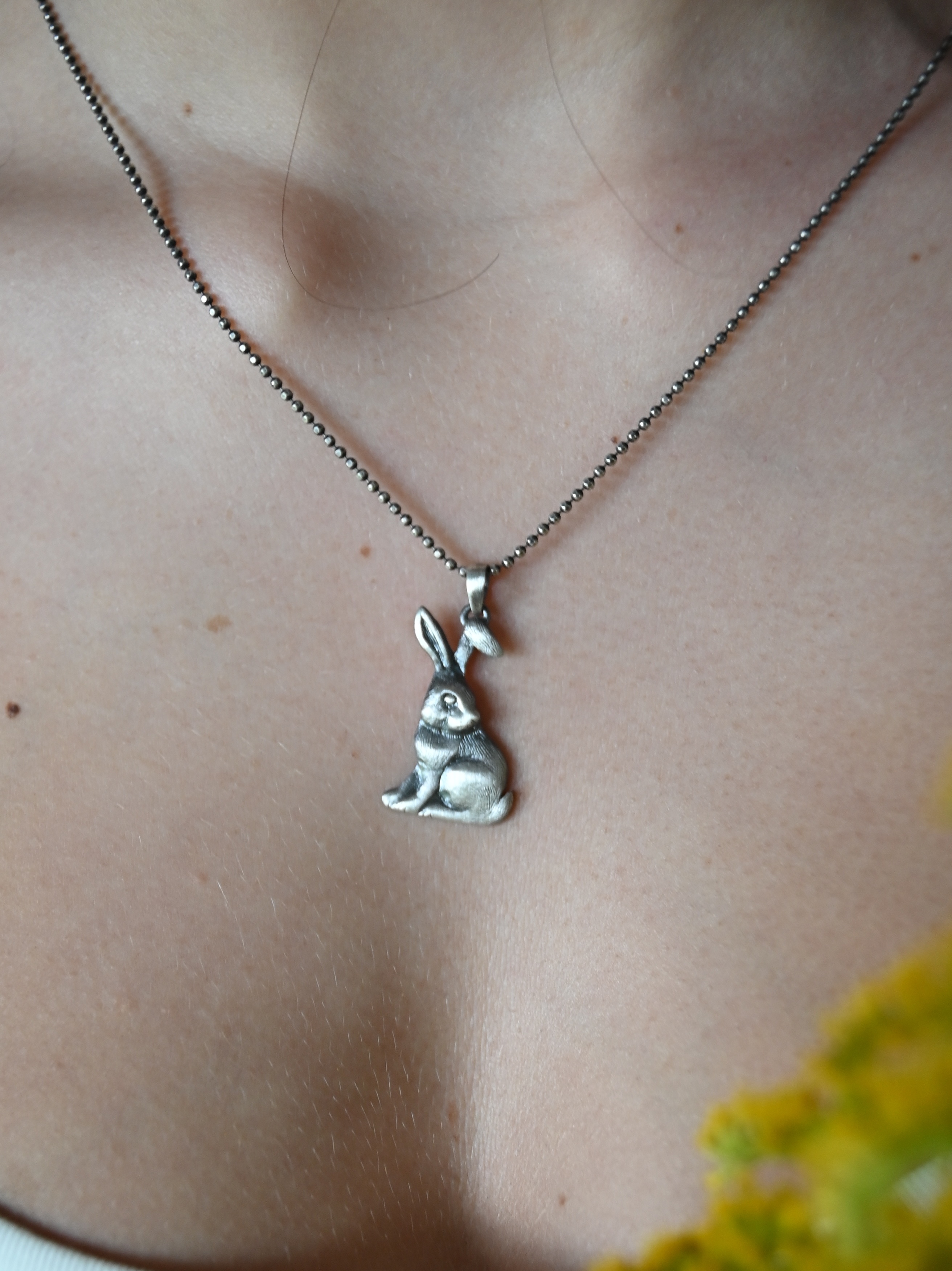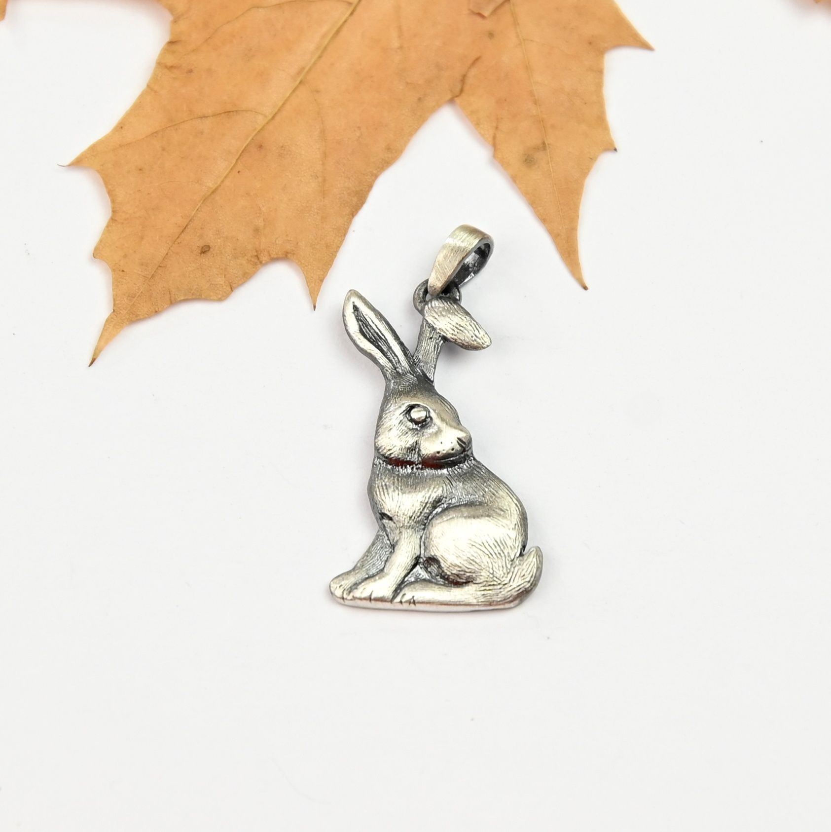 Mały zajączek z oklapniętym uszkiem - symbol czułości i delikatności, zamknięty w srebrze, które szepcze historie lasu.