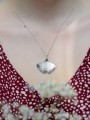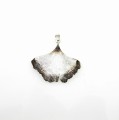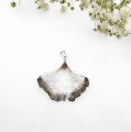 Uroczy wisiorek srebrny w kształcie listka miłorzębu w białym kolorze z ciemną oksydą na brzegach listka.