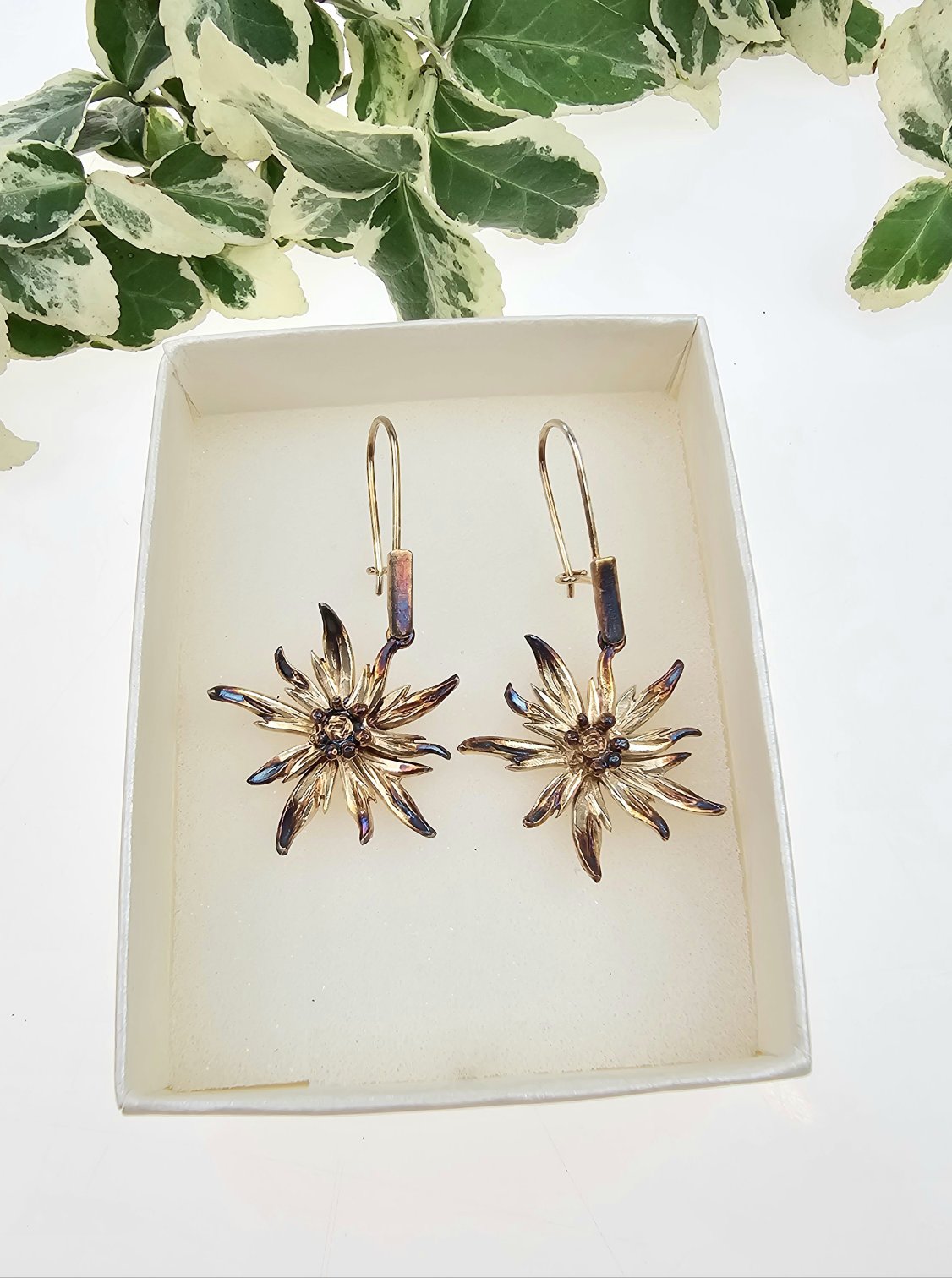 Kolczyki są lekkie i wygodne w noszeniu, ważą 6,5 gramów, co pozwala nosić je przez cały dzień z komfortem. Kwiat szarotki na tych kolczykach ma szerokość 2,5 cm, a całkowita długość kolczyków wynosi 4,5 cm, co sprawia, że są one efektowną ozdobą na uszach.