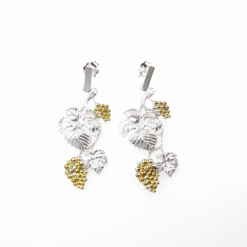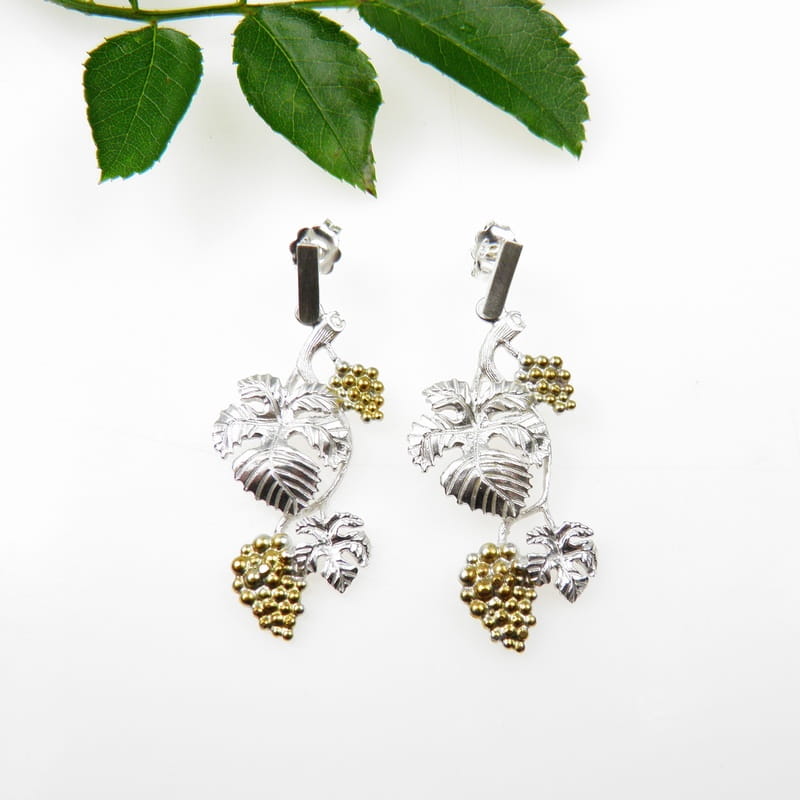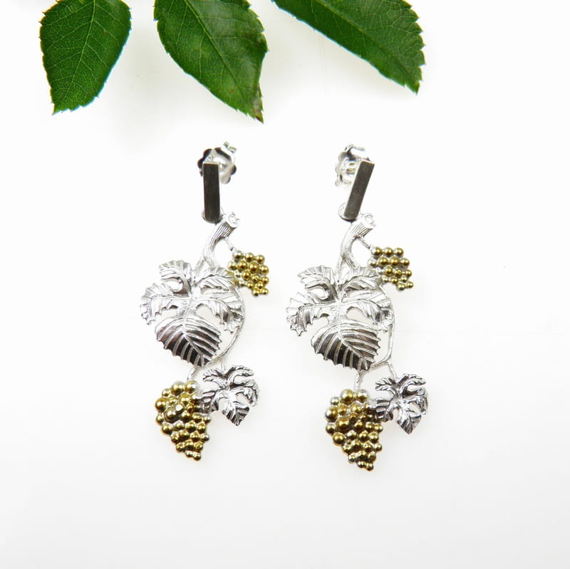 Urocze kolczyki srebrne przedstawiające motyw kiści winogron zwisających wśród listków.