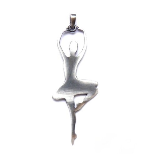 Wisiorek srebrny przedstawiający figurę tańczącej baletnicy.