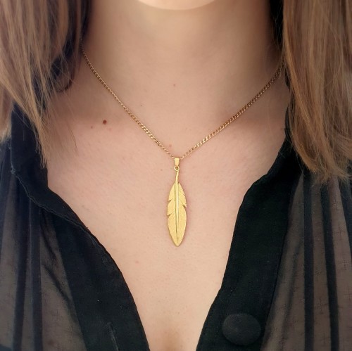 Urocza zawieszka w kształcie piórka, wykonana ze srebra, następnie została pozłocona.