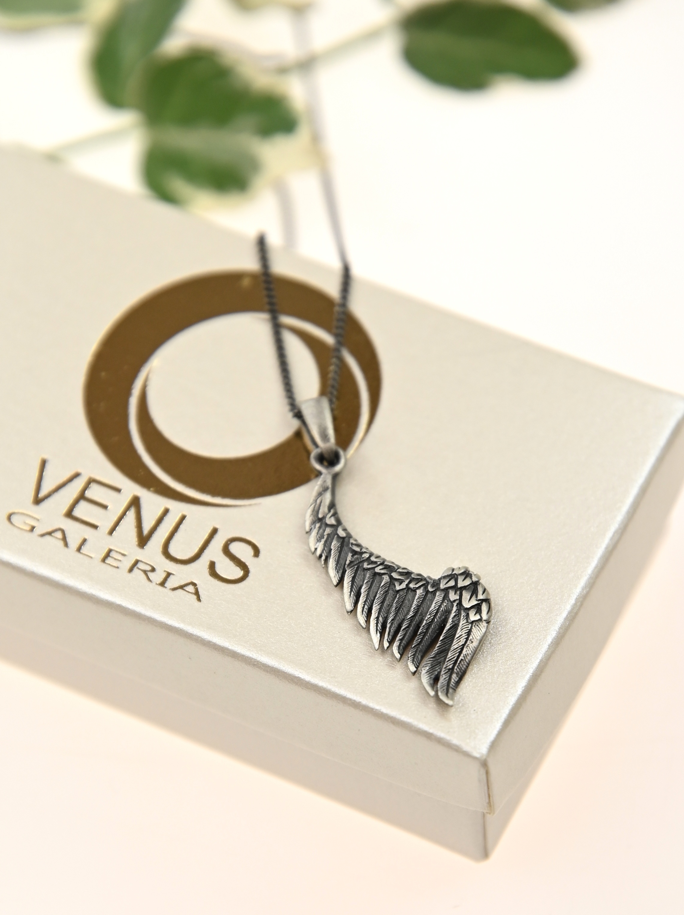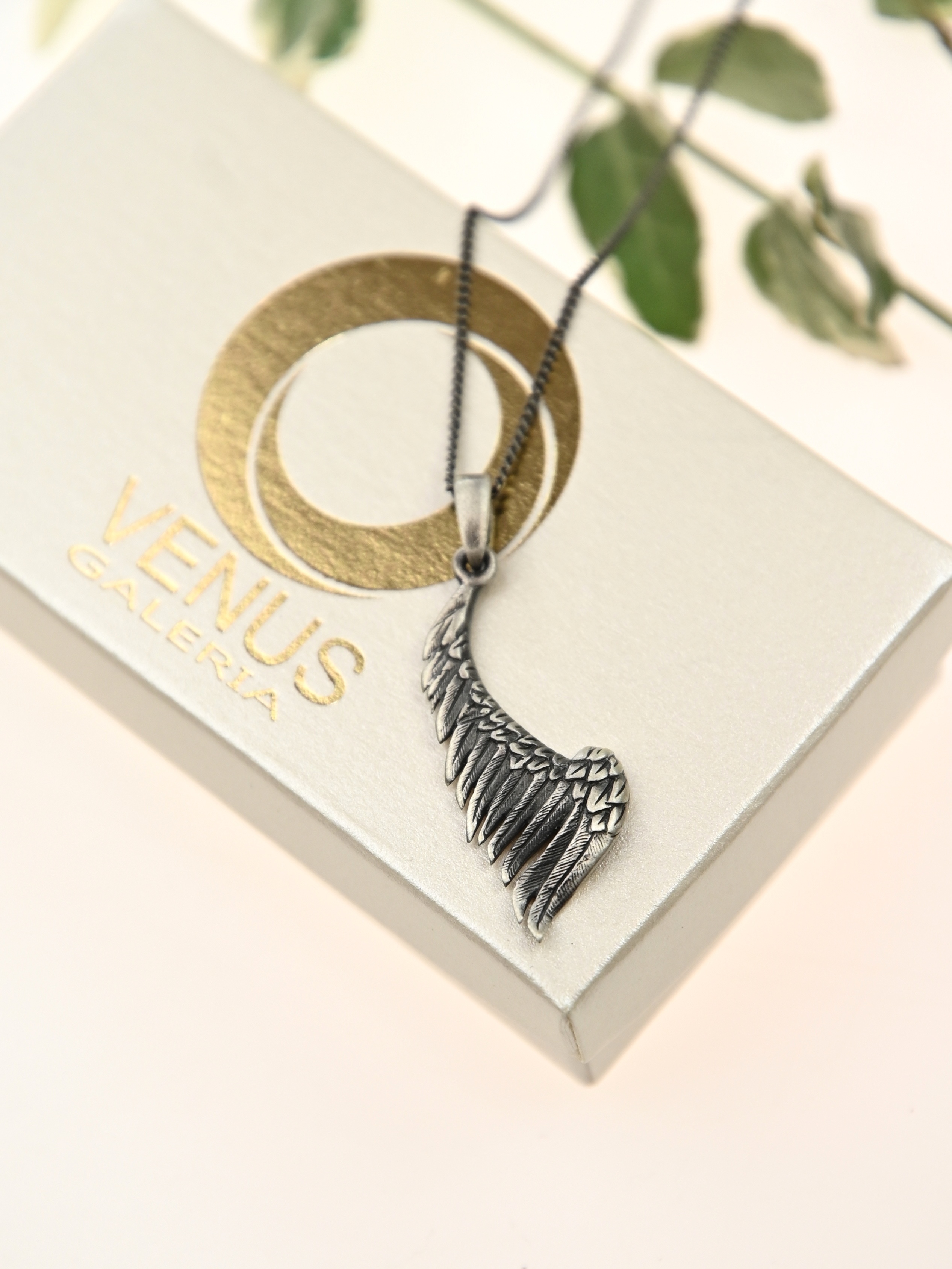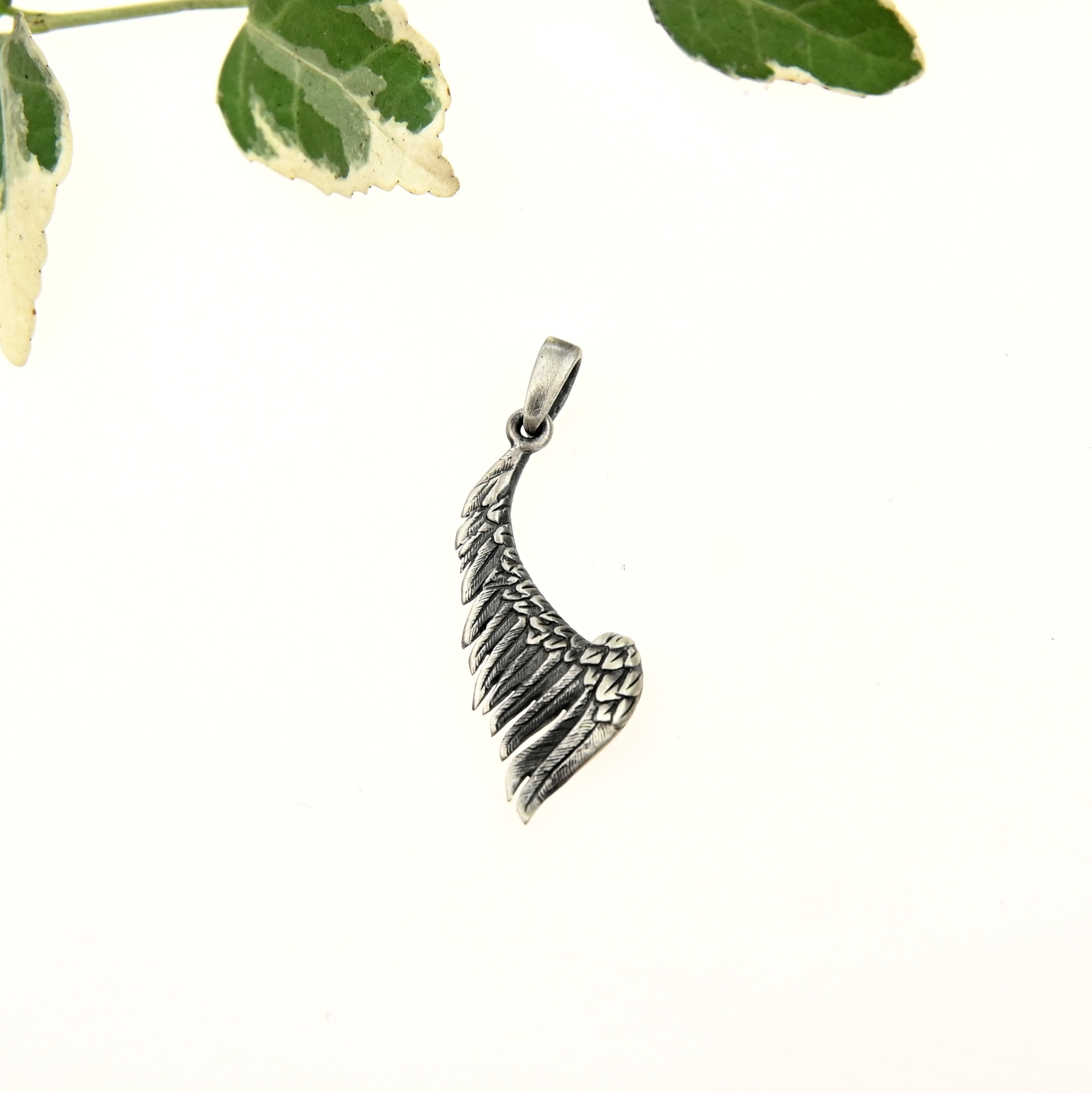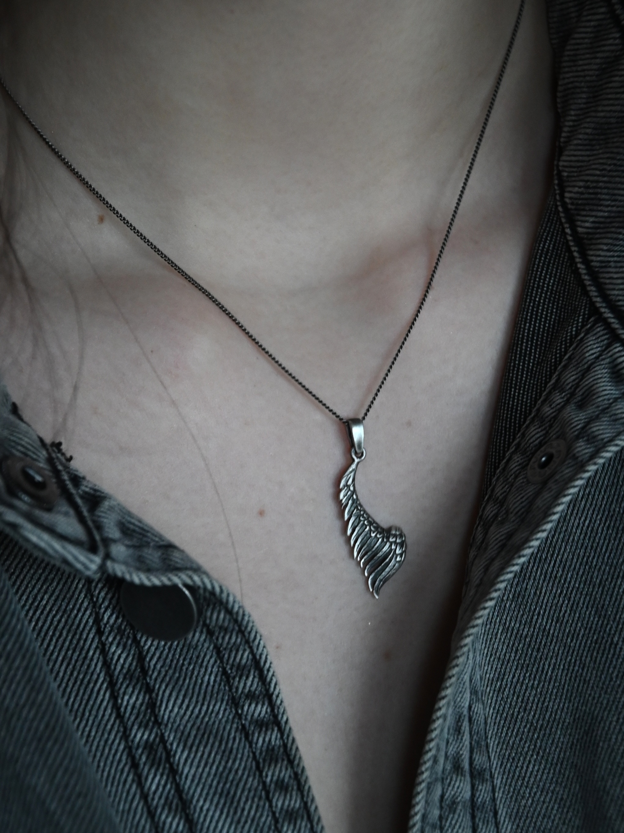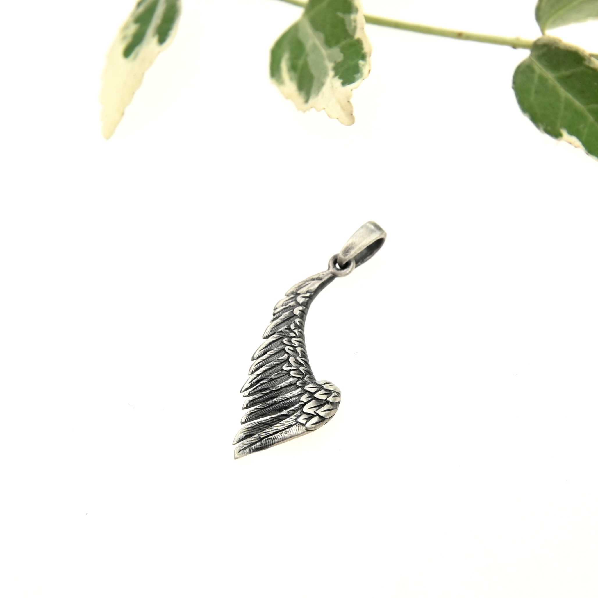 Srebrny wisiorek w kształcie skrzydła anioła.